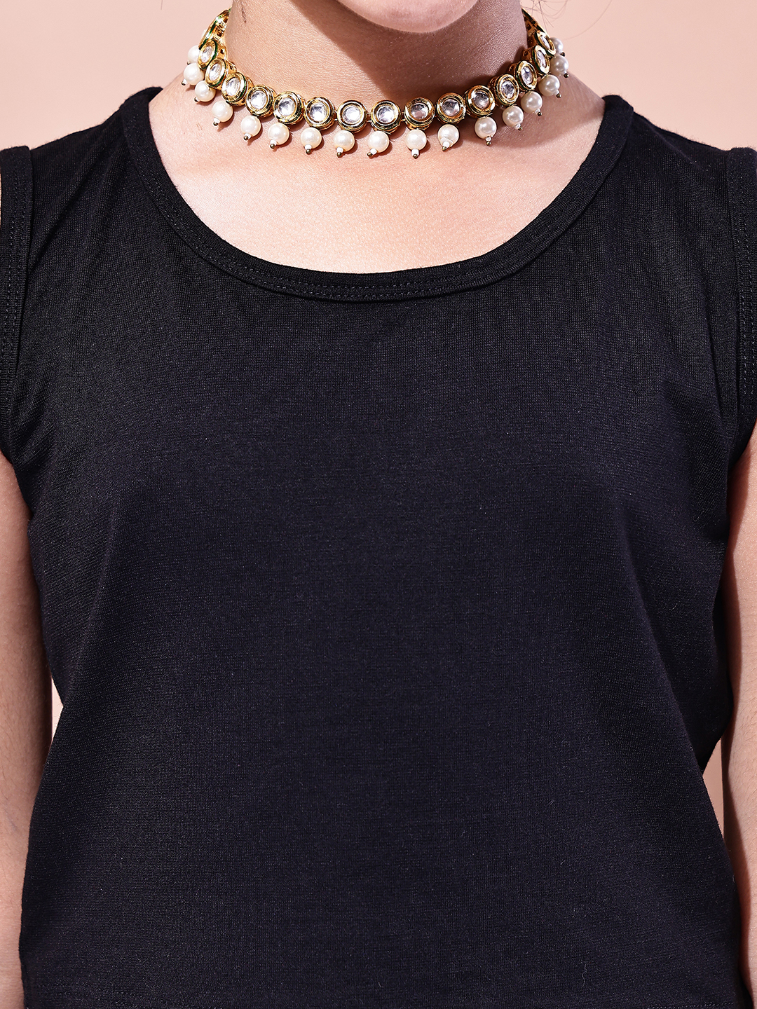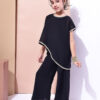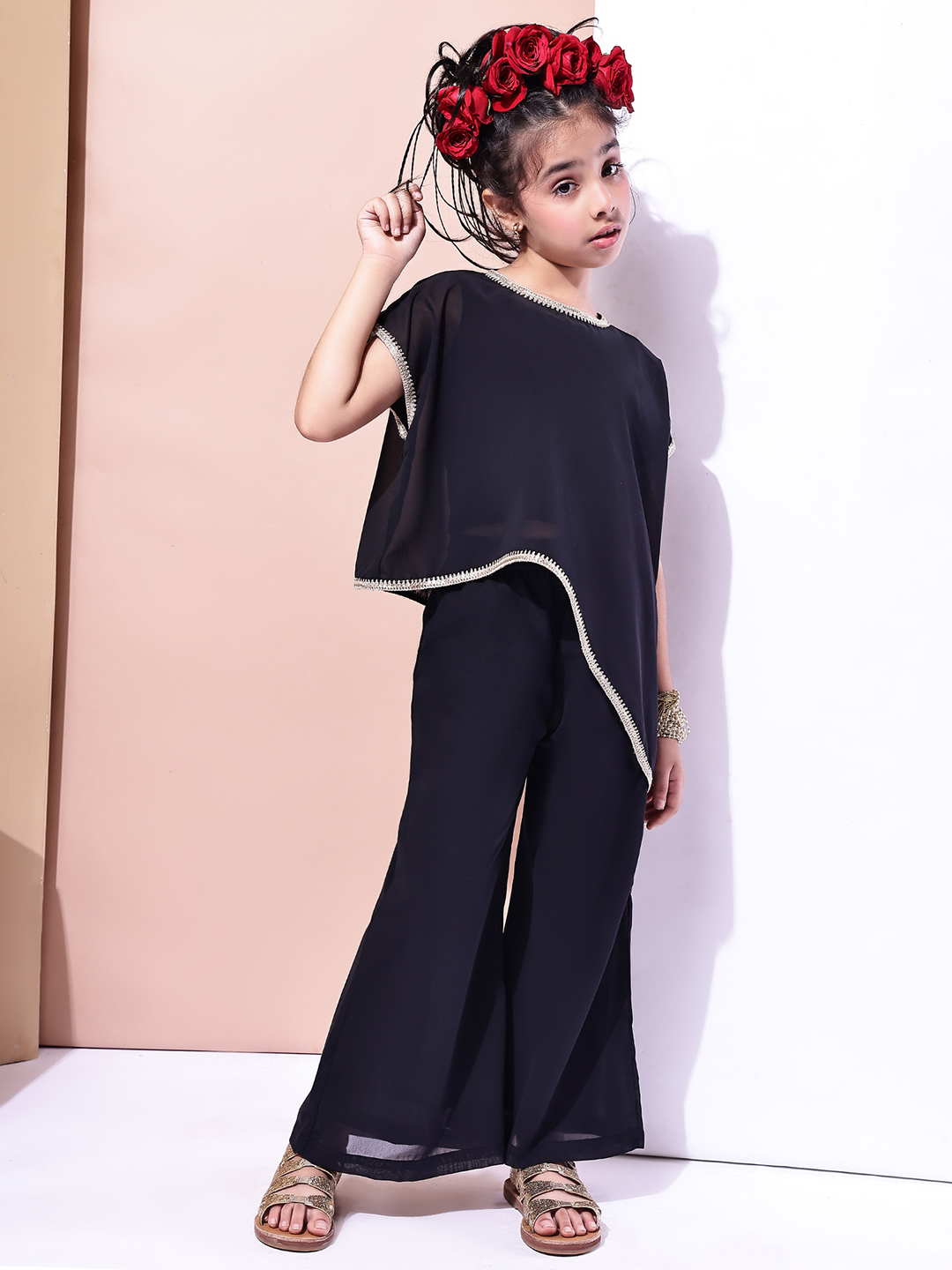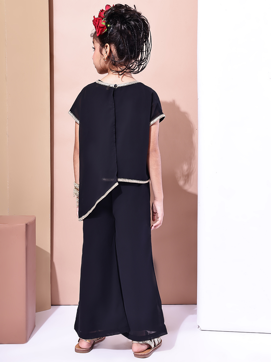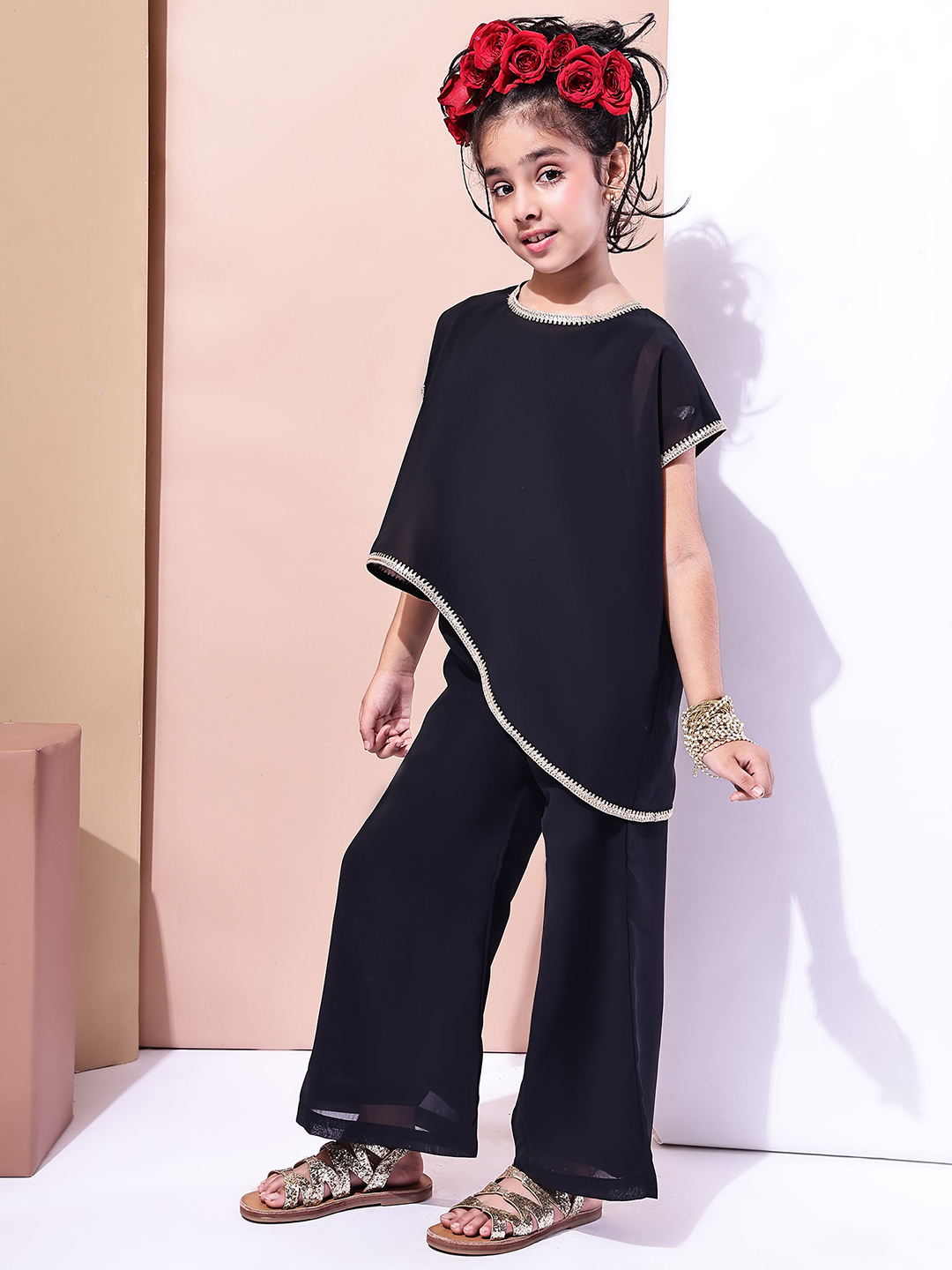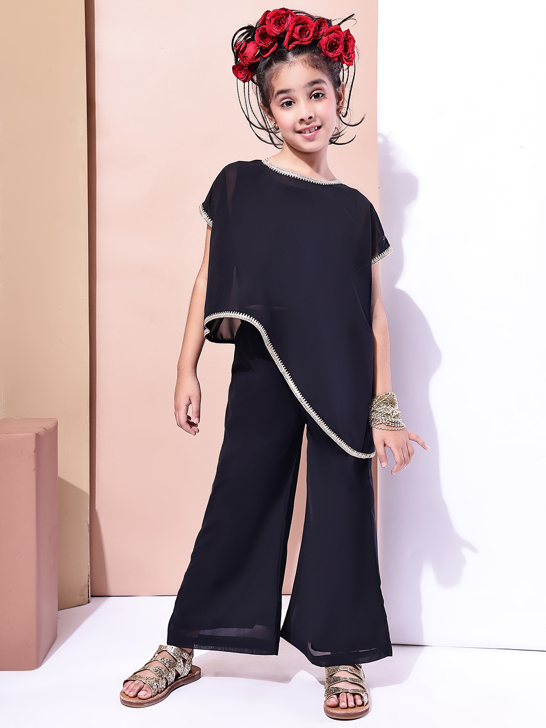 Girls Black Georgette Festive Co-ord Set | Asymmetric Overlay Top with Inner | Party & Ethnic Wear