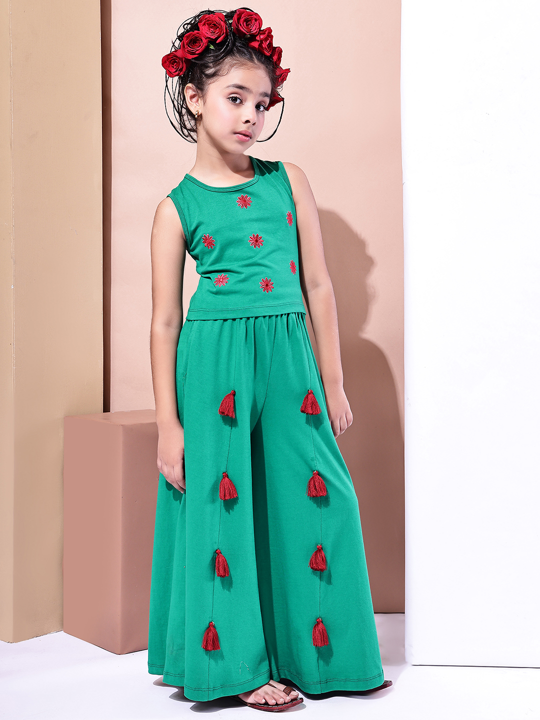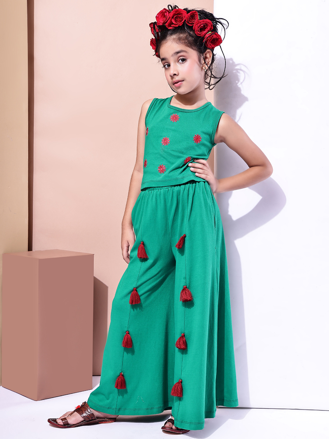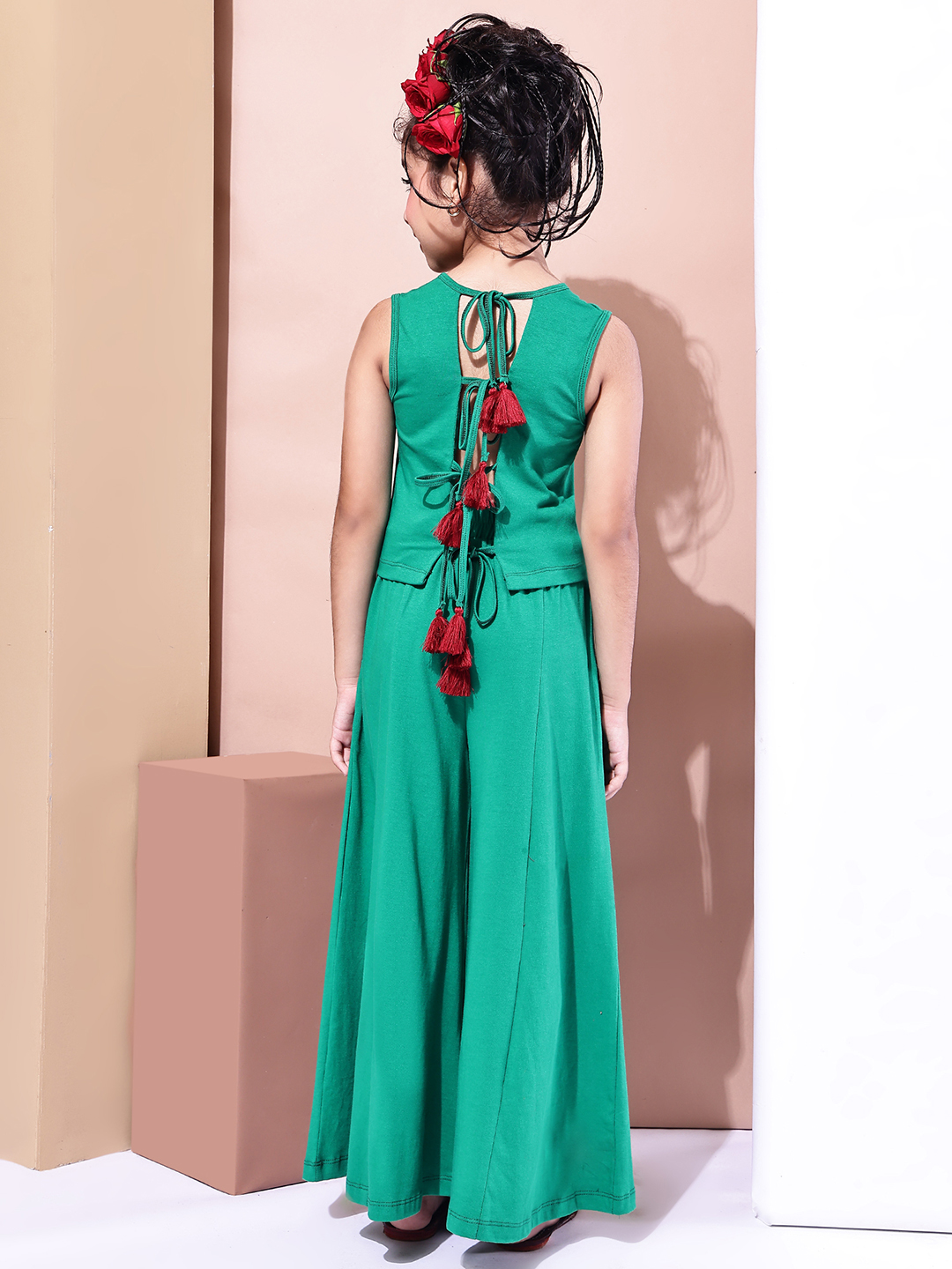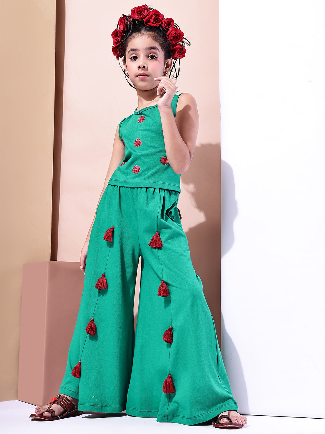 Girls Forest Green Cotton Plazo Set with Embroidered Top, Tassel Accents & Mesh Detailing – Festive & Ethnic Wear for Girls