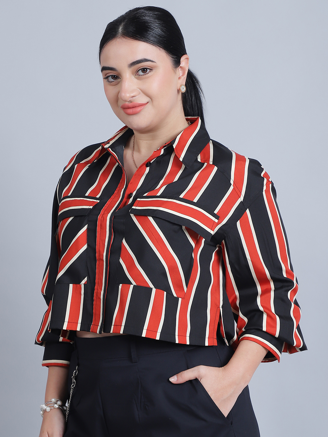 BaawRi shirt features a collared neckline, full sleeves, and a front open button design for closure. The shirt is adorned with a stripe print pattern. It has a short, straight hemline and two pockets in the front for added functionality and style.