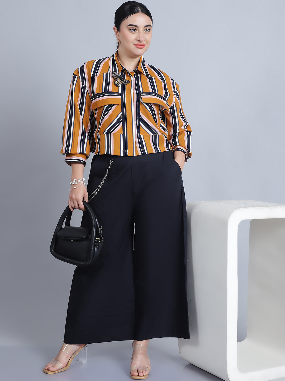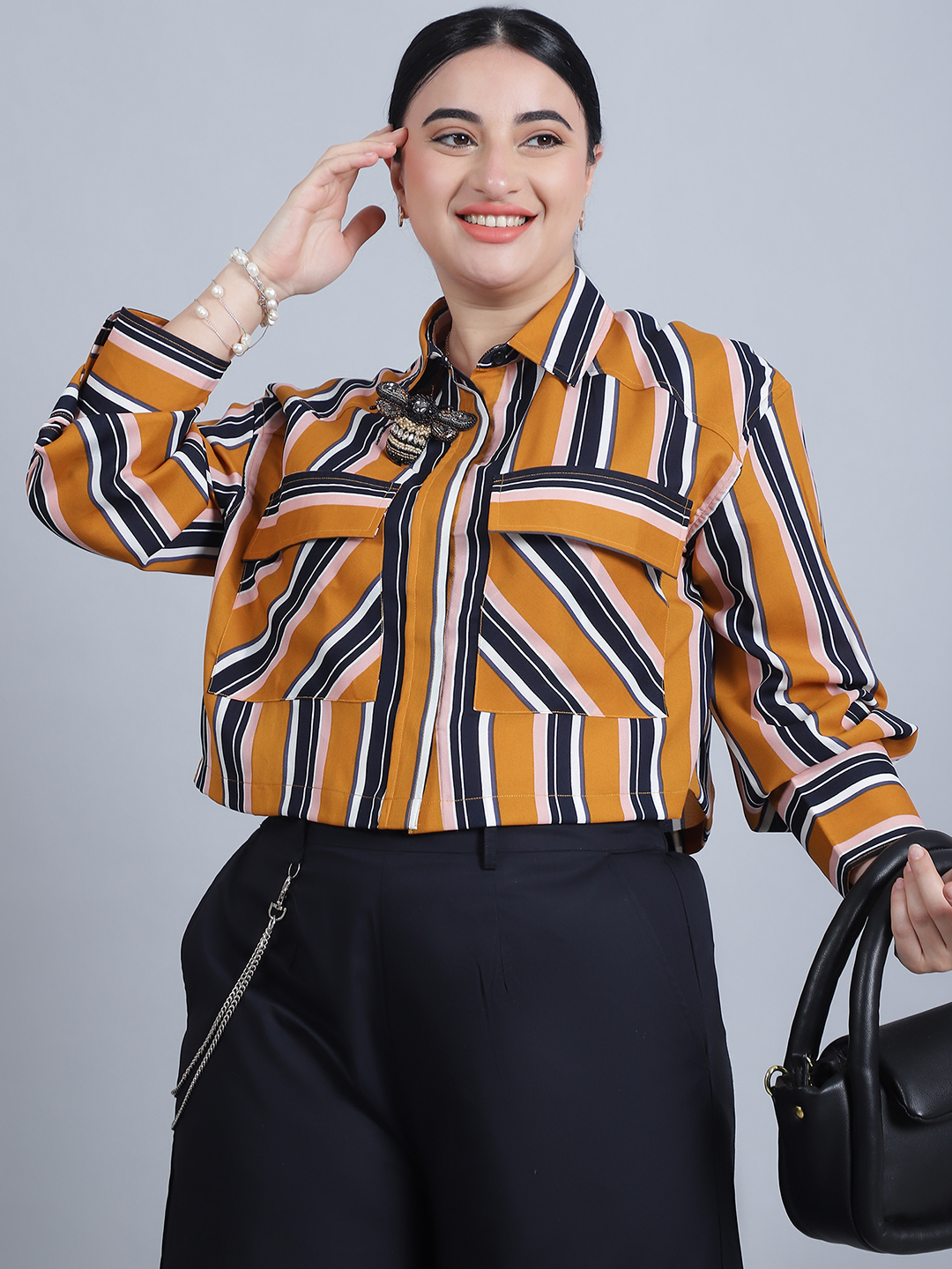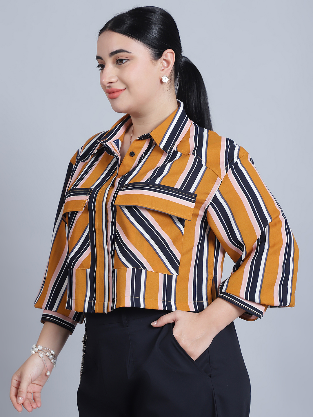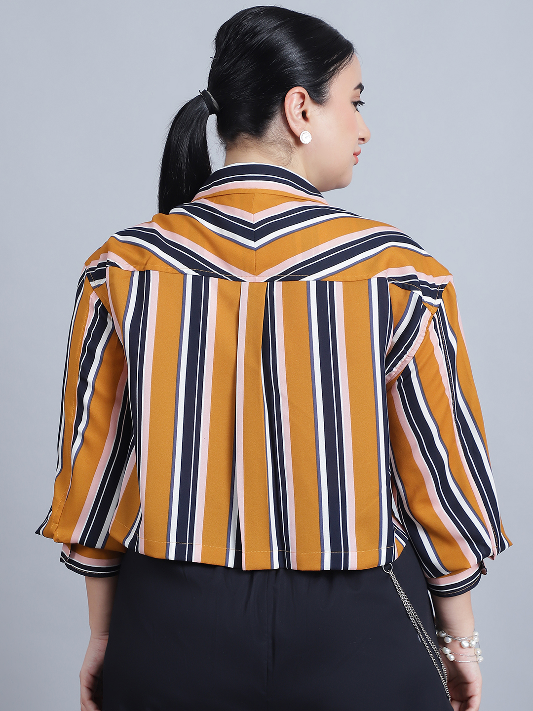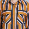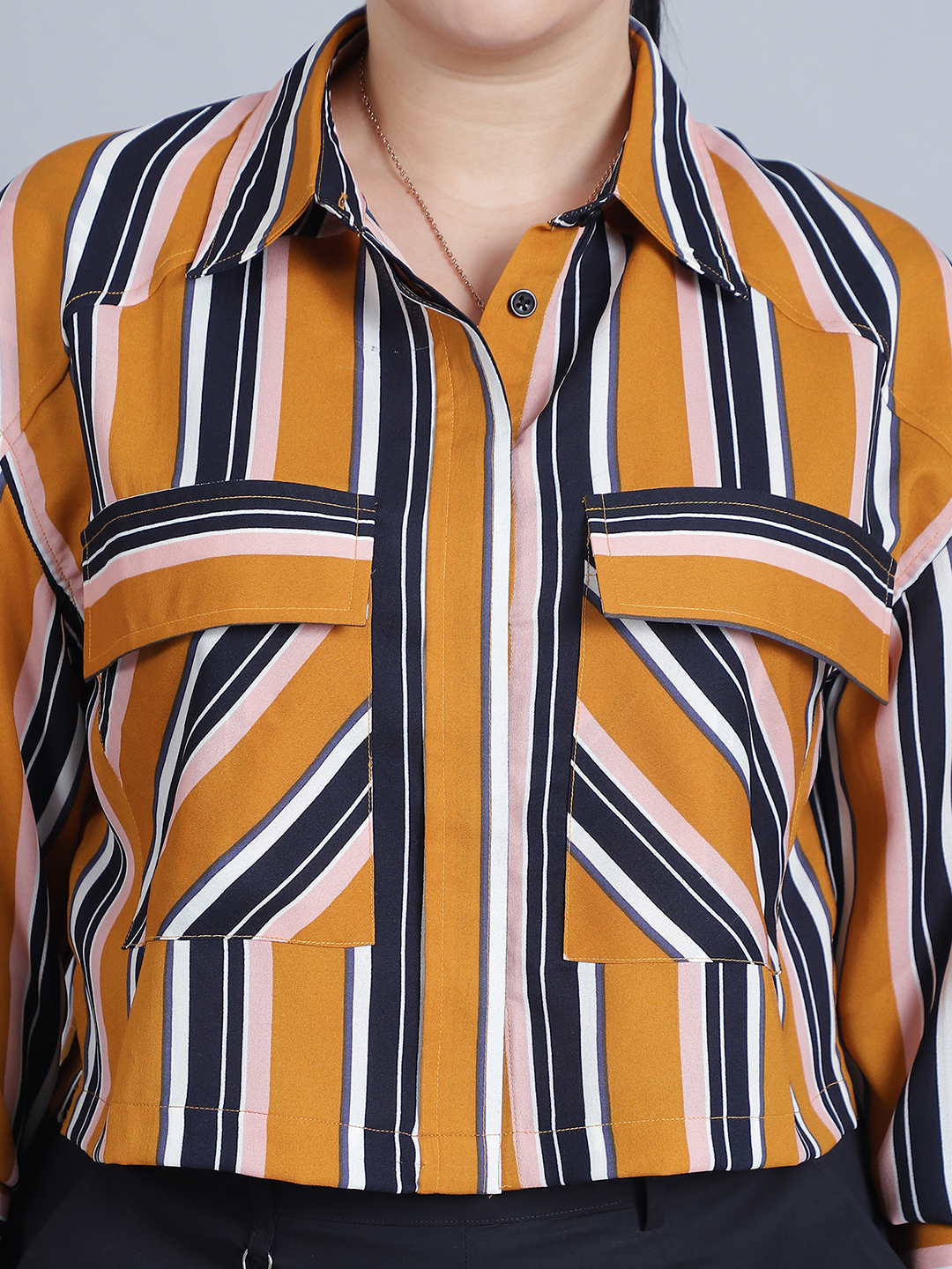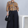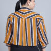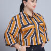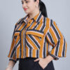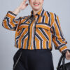 Women’s Shirt Colar, Full Sleeves & Front Open Stripe Printed Short Top