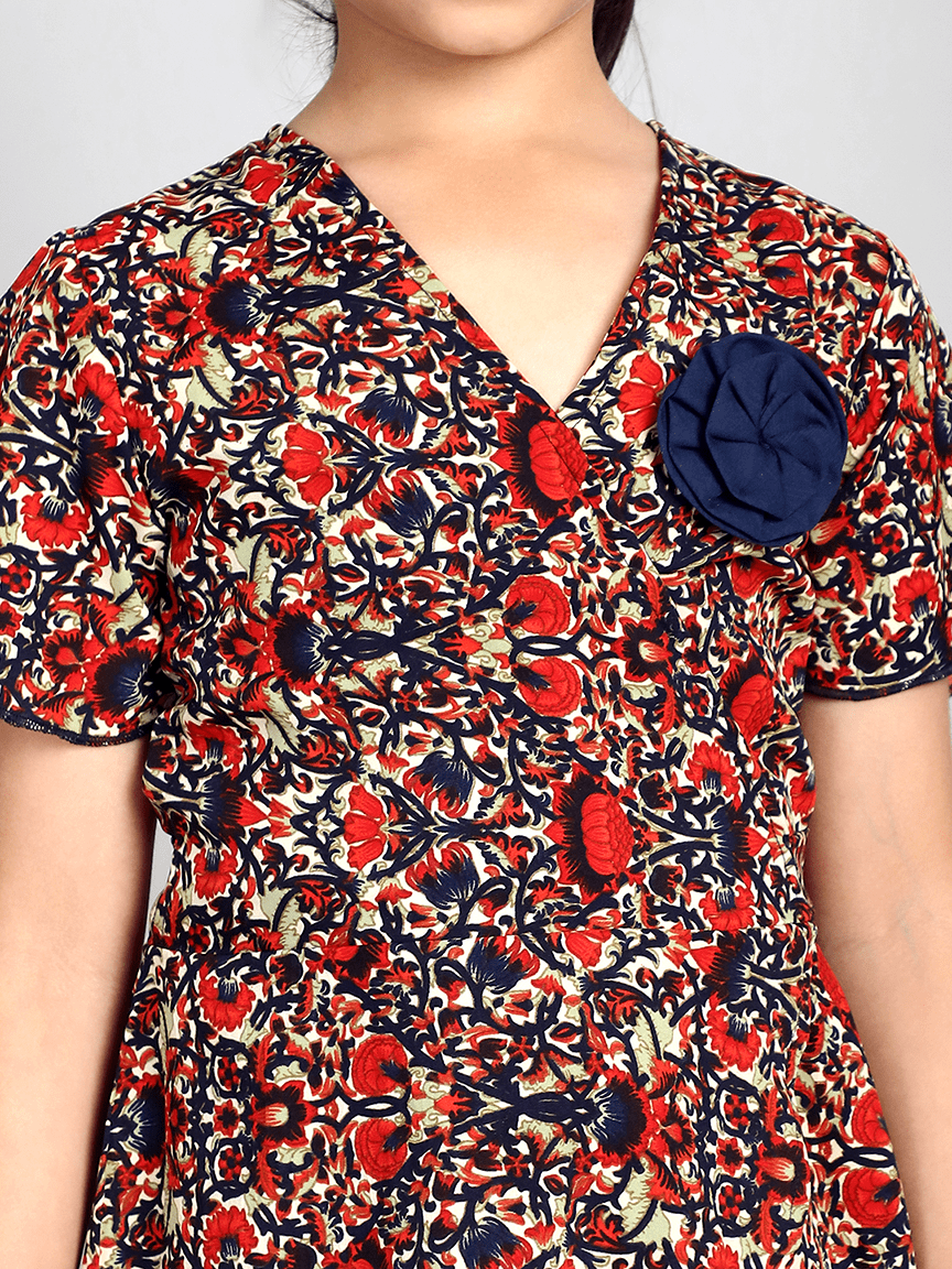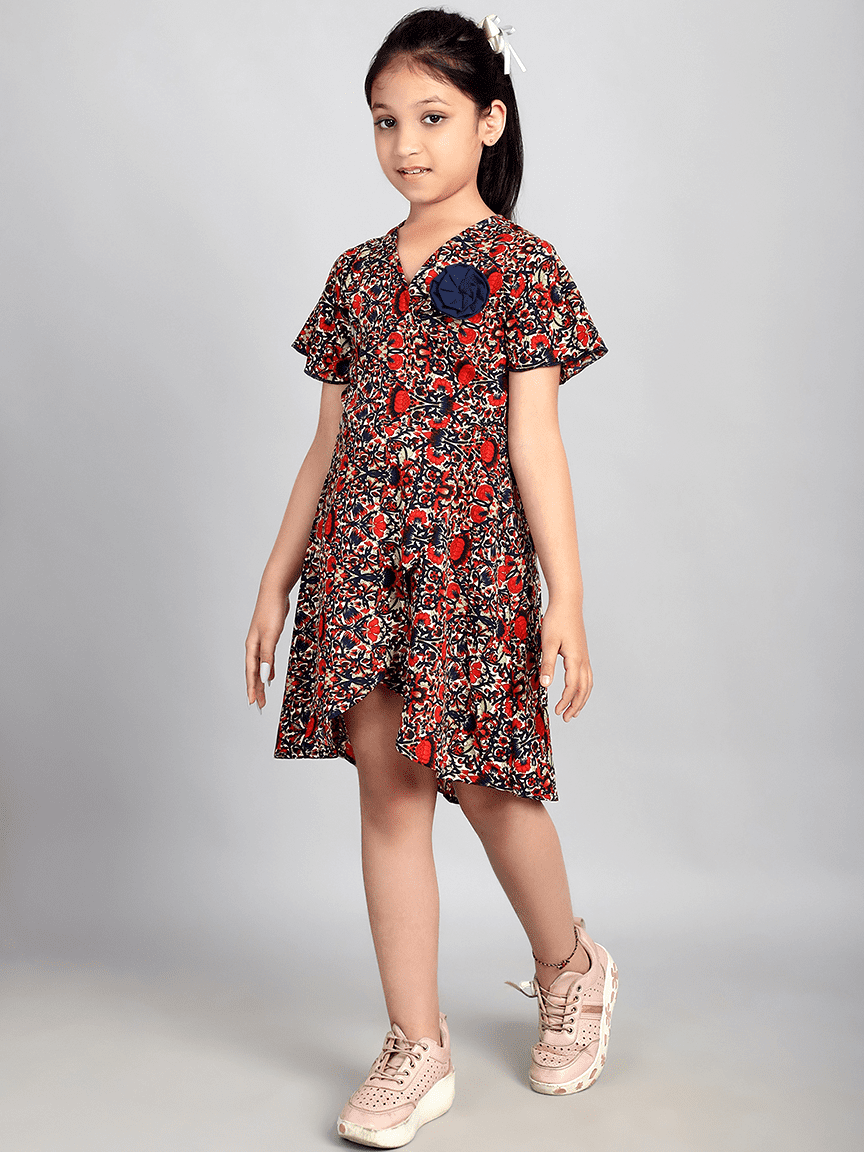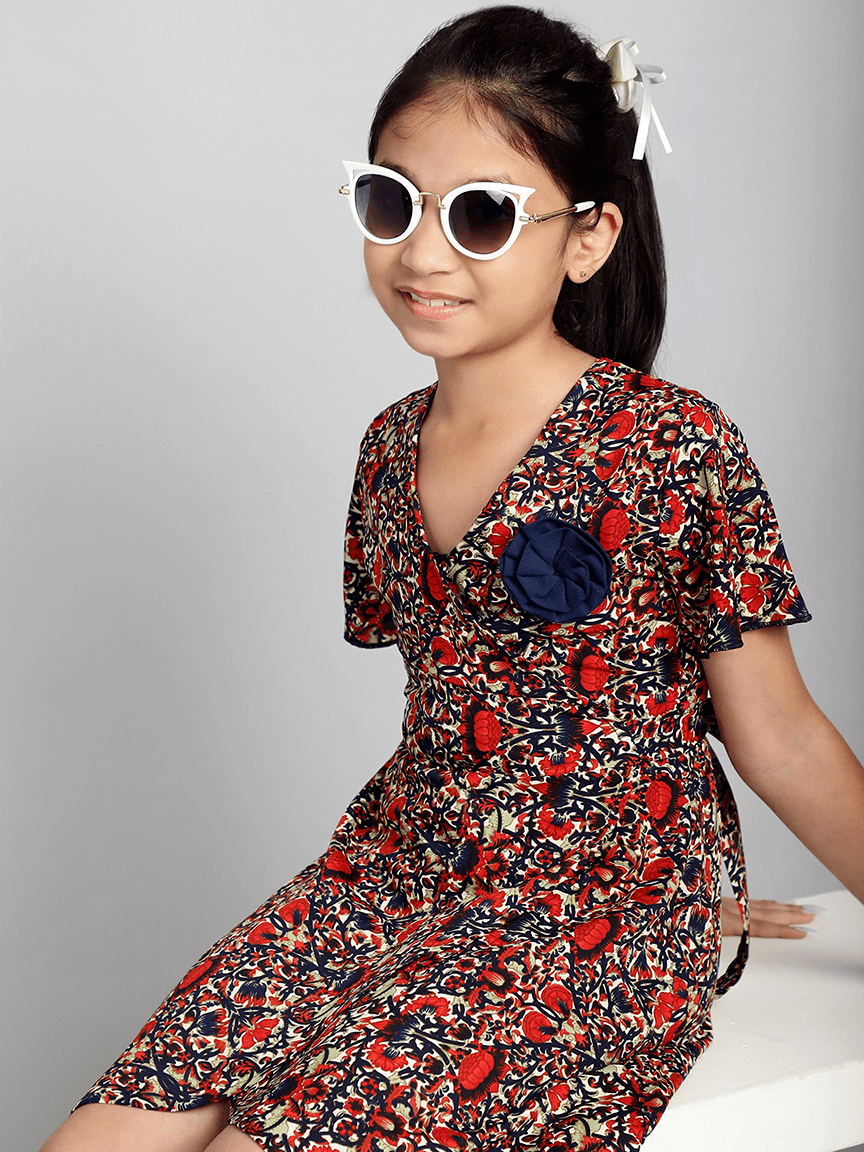 Baawri Girl Crepe Red Printed Color Knee Length Wrap Dress