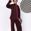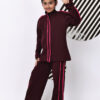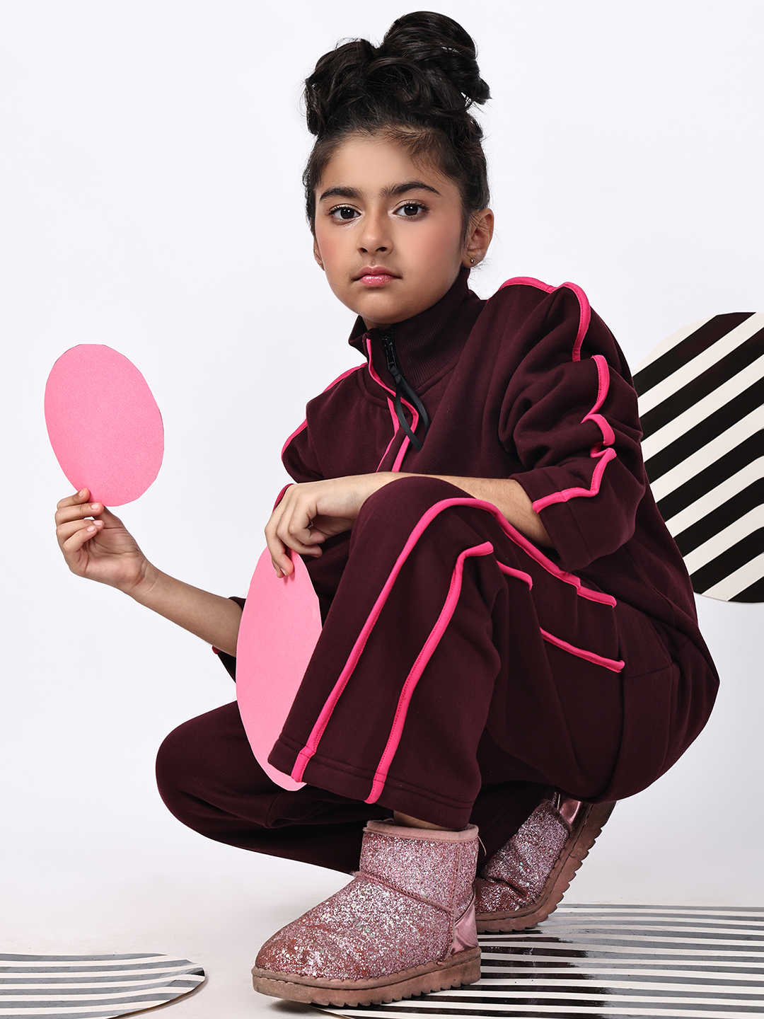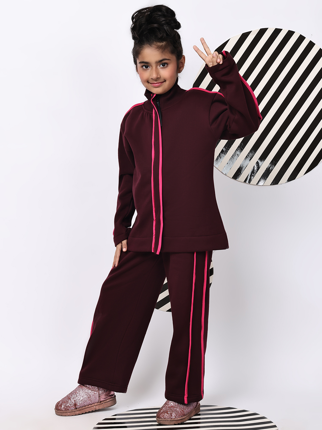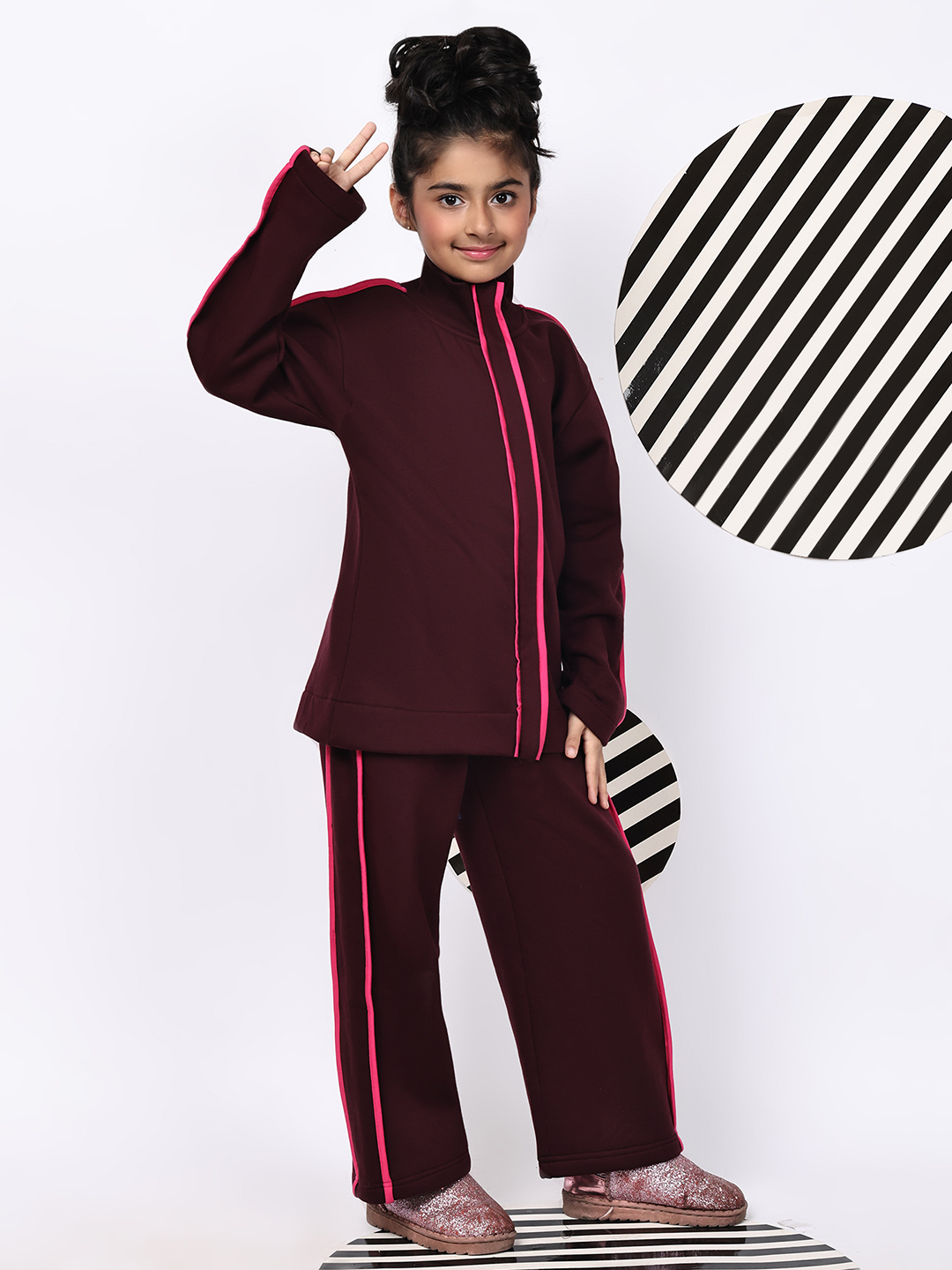 BaawRi Girls Fleece Tracksuit Set – Wine Jacket & Pants with Pink Piping | Soft Winter Warm Sweatshirt & Joggers Co-ord Set