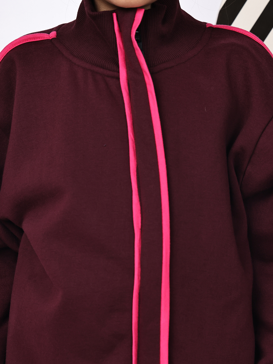 - Trendy Red Jacket – Zip-up sweatshirt with wine piping detail adds a bold, sporty touch