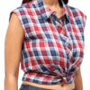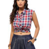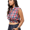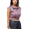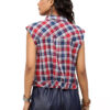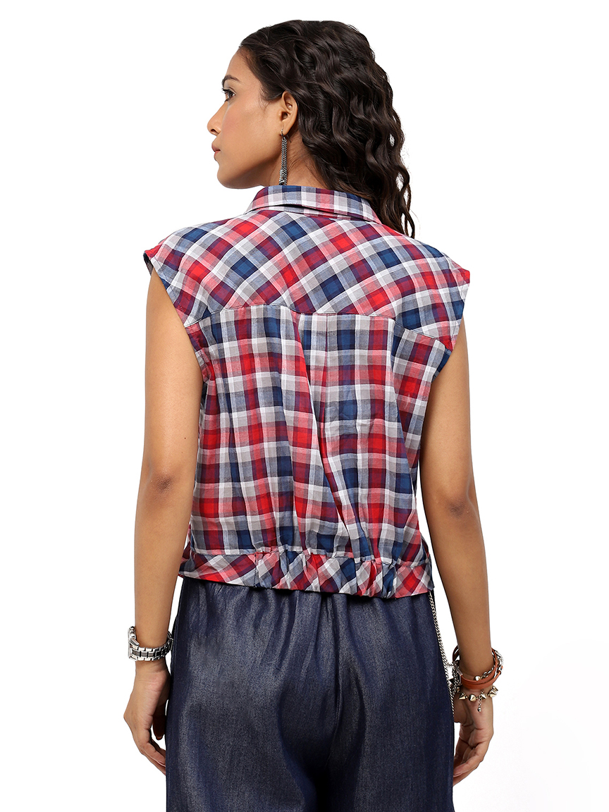 BaawRi Pink & White Check Print Cotton Woven Top, has a shirt collar, sleeveless and knot detail at bottom of top.