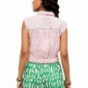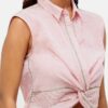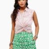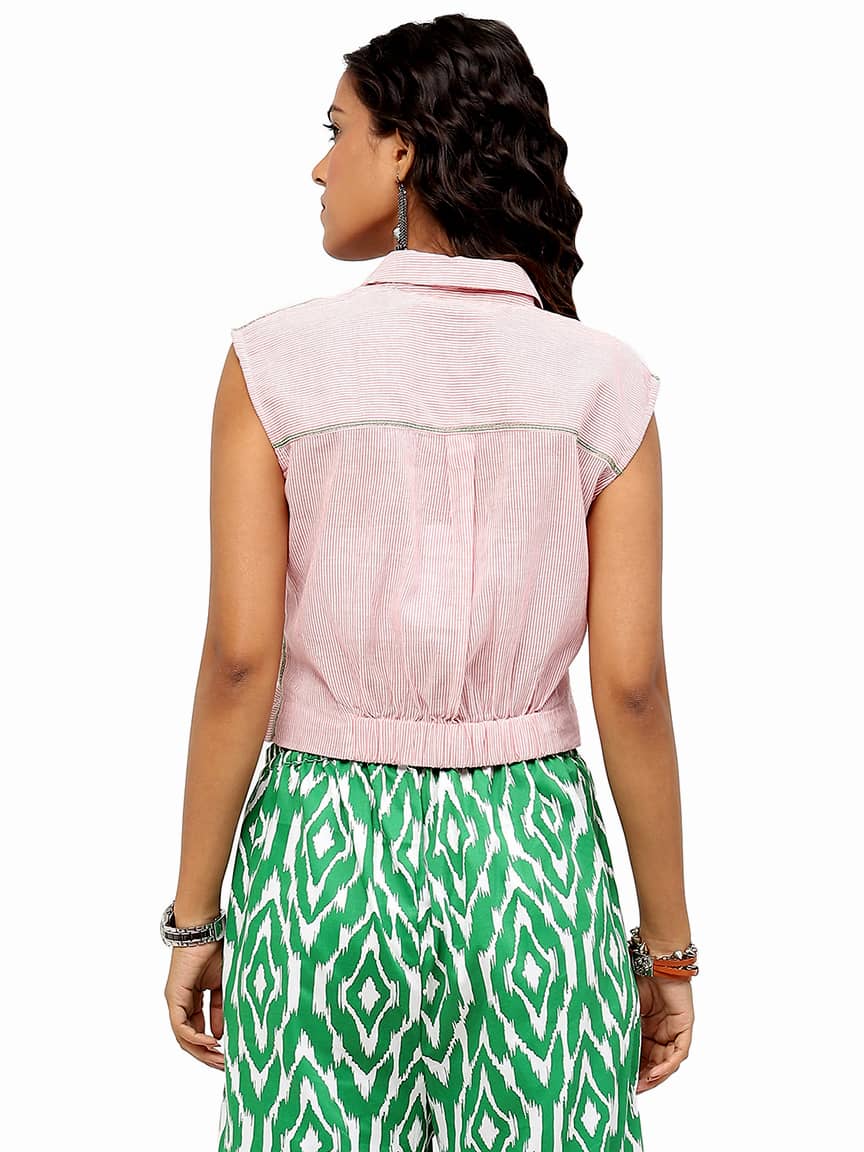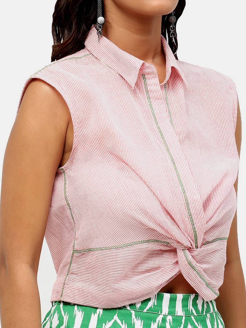BaawRi Pink & White Stripe Print Cotton Woven Top, has a shirt collar, sleeveless and knot detail at bottom of the top.
