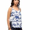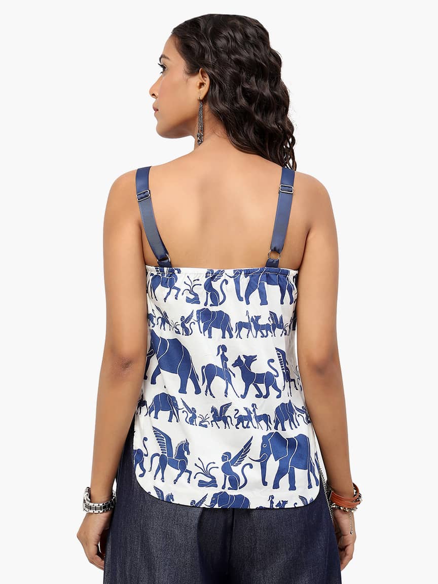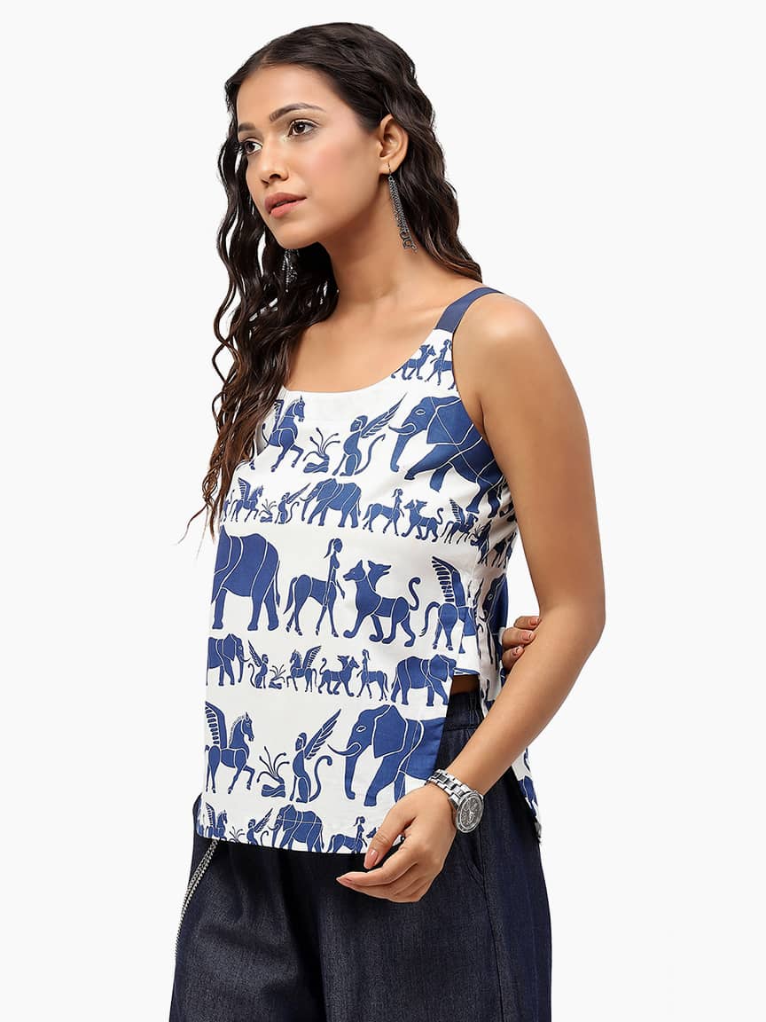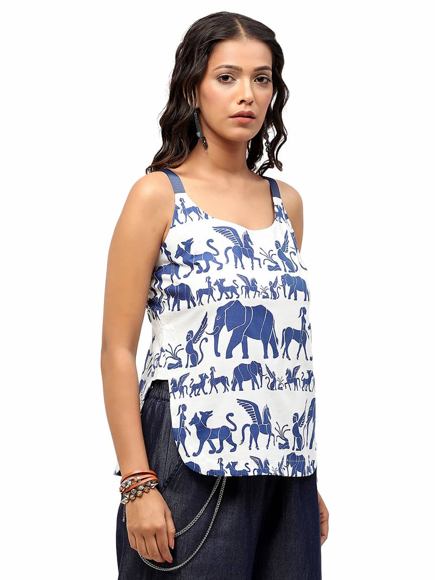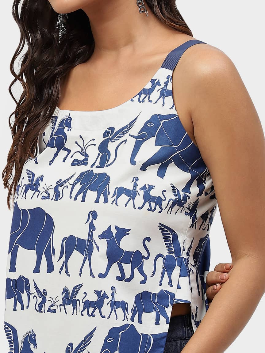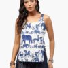 BaawRi Women’s Animal Print Cotton Woven Top, has a shoulder stripe square neck, sleeveless and curved hem.