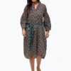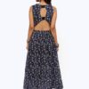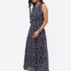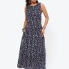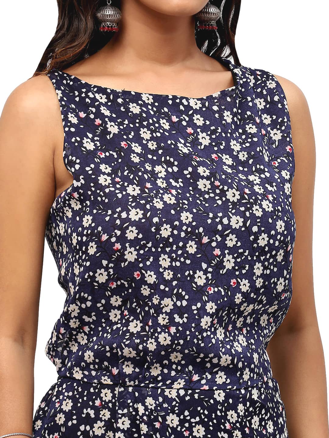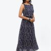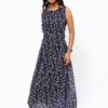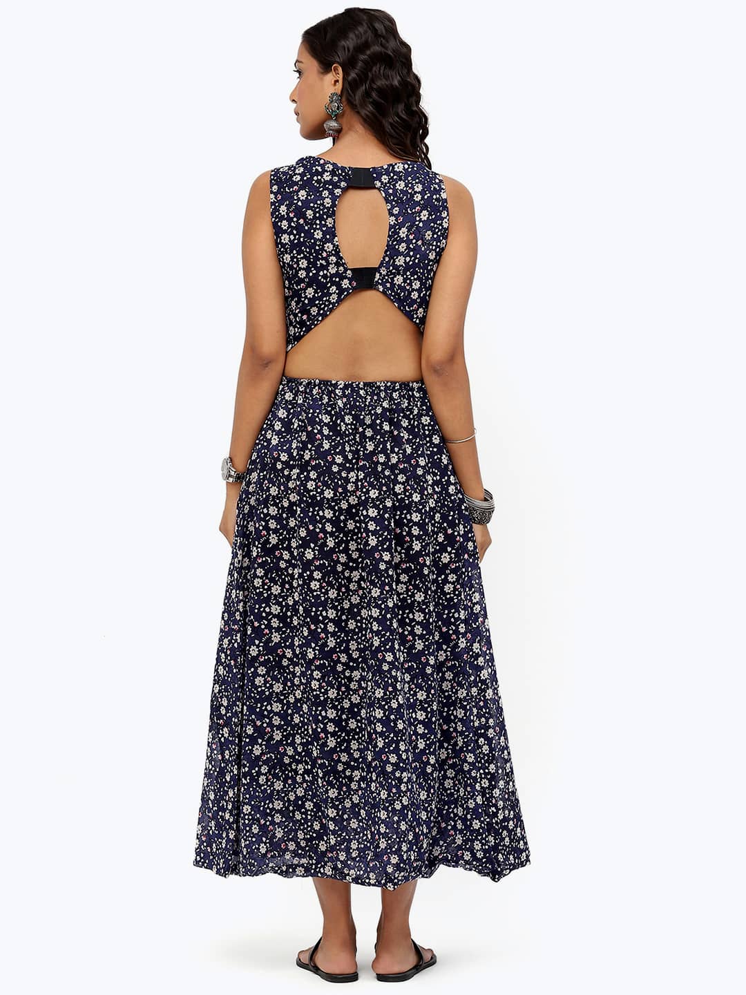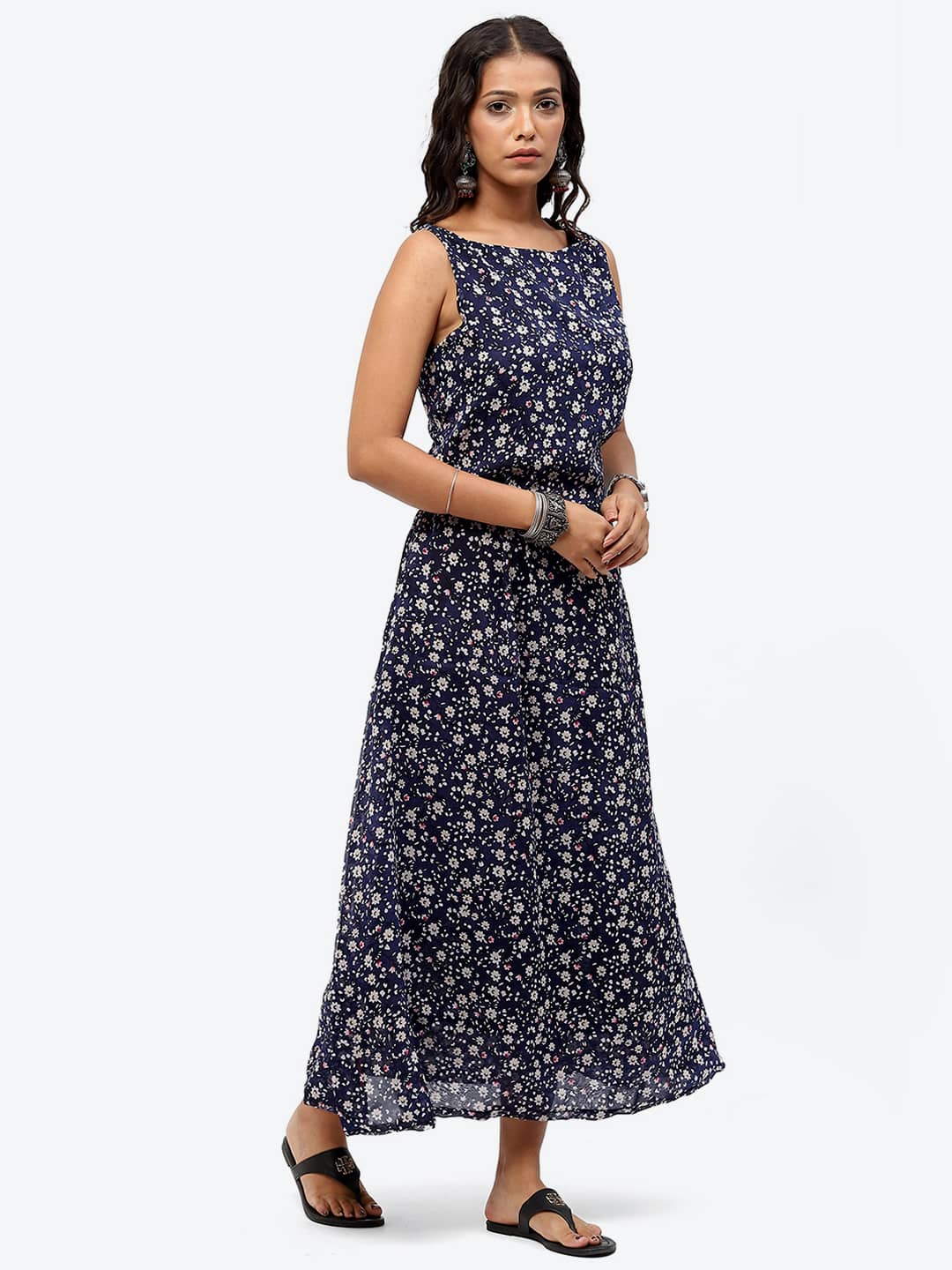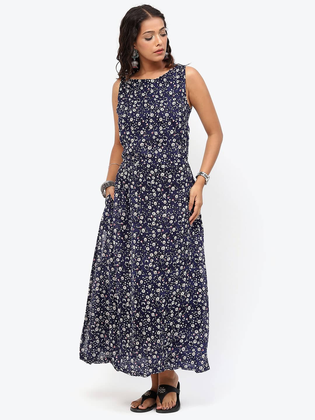BaawRi Women’s Blue Floral Printed Dress, has a square neck, ankle lenght, two pocket, sleeveless & high low hem.