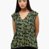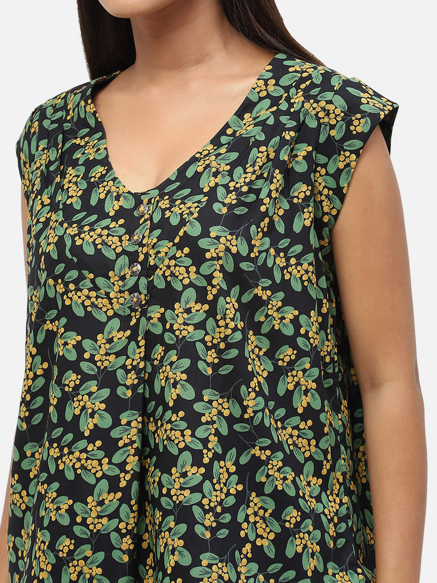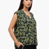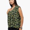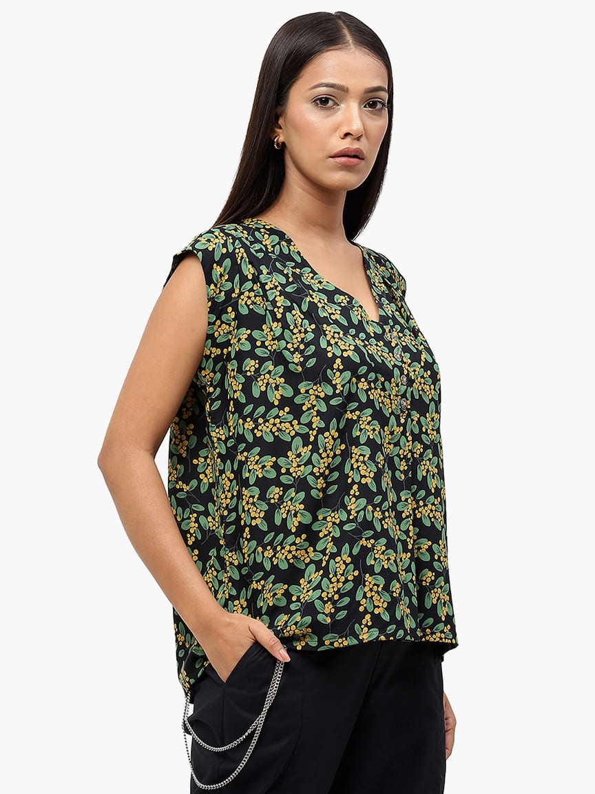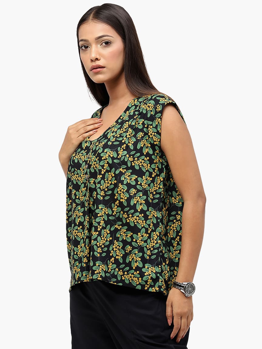 BaawRi Women’s Green Floral Printed Viscose Rayon Top, has a V neck, sleevless and straight hem.