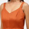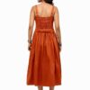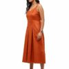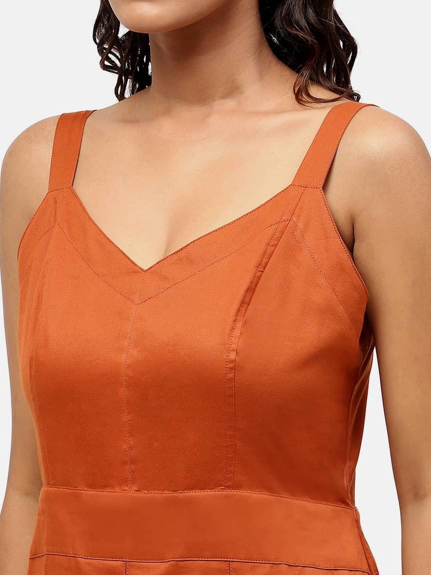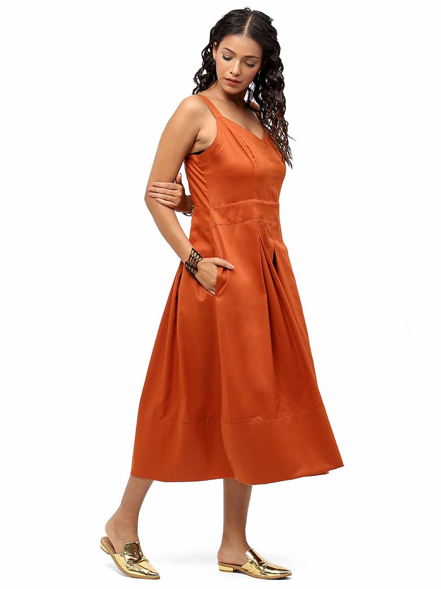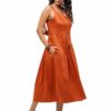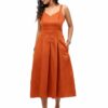 BaawRi Women’s Orange Solid Color Cotton Dress, has a V-neck, two pocket, Sleeveless, midi lenght and straight hem.