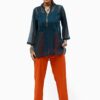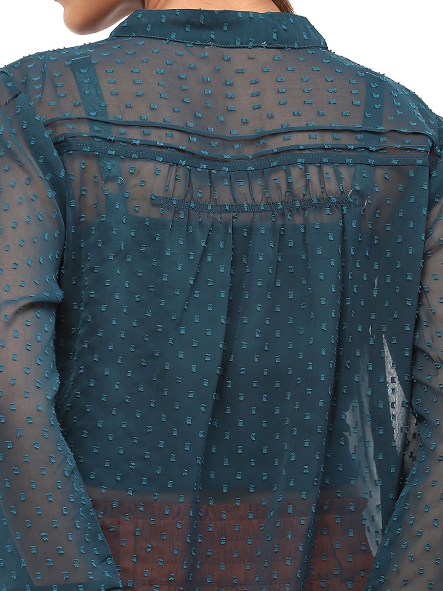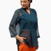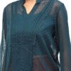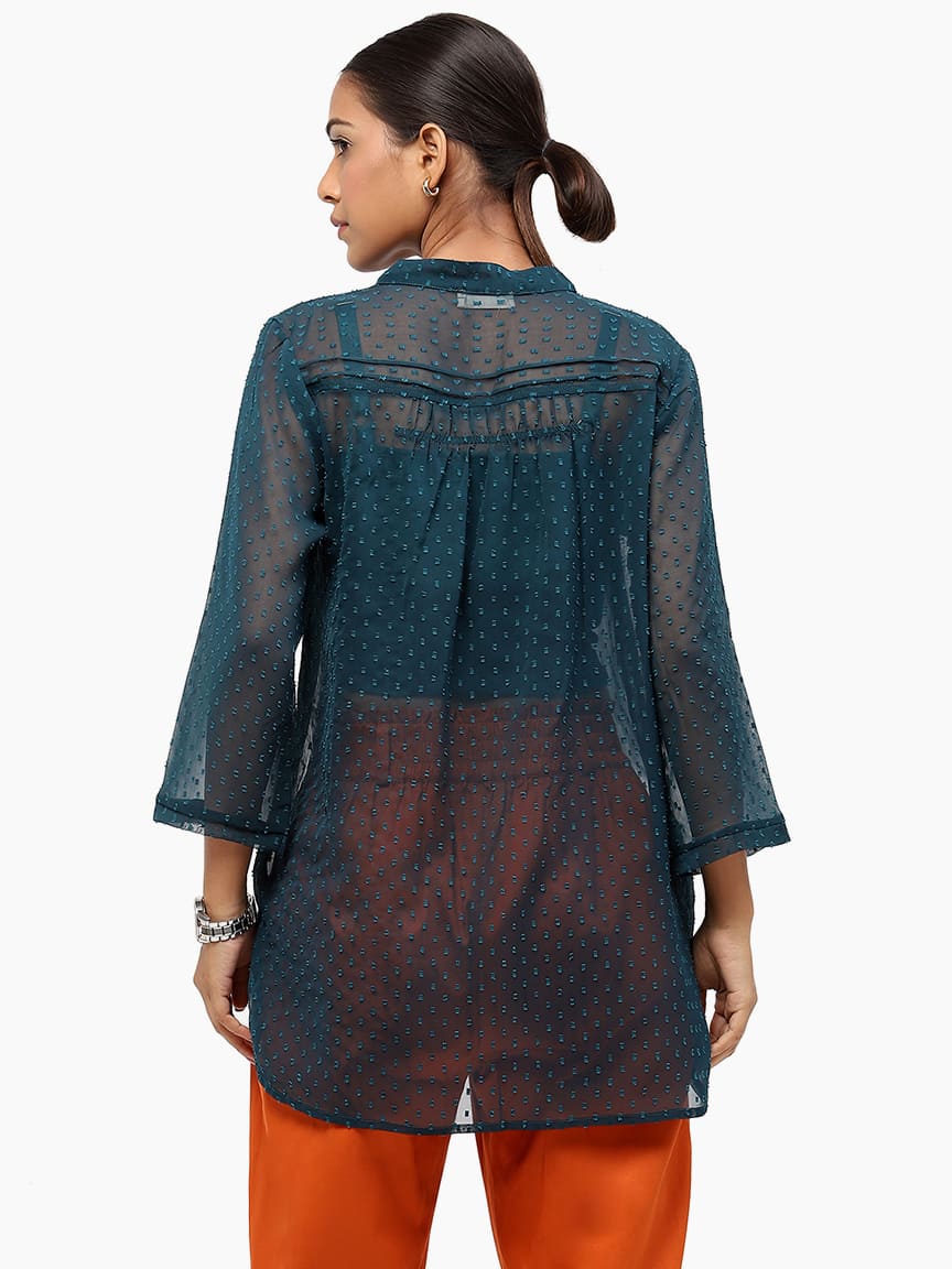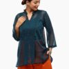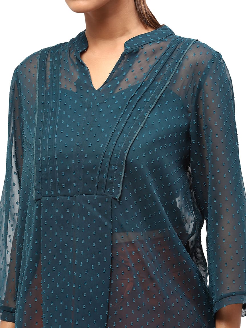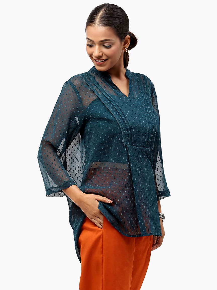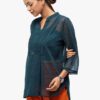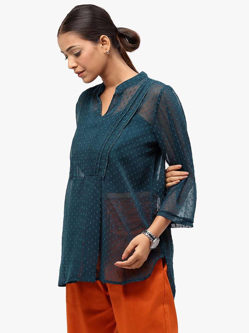 BaawRi Women’s Teal Solid Color Top, has a mandarin collar, 3/4th sleeve, pleated and curved hem.