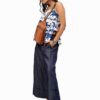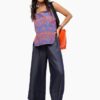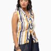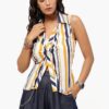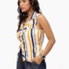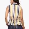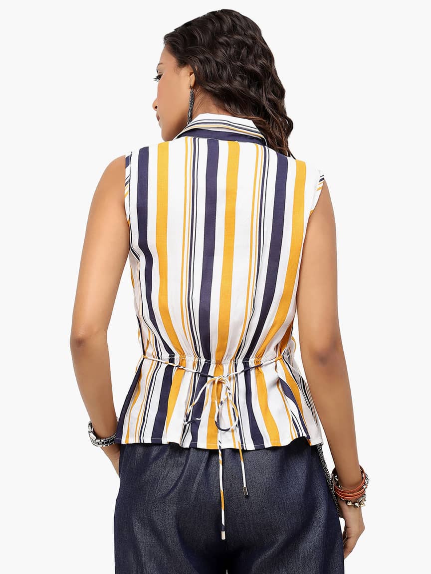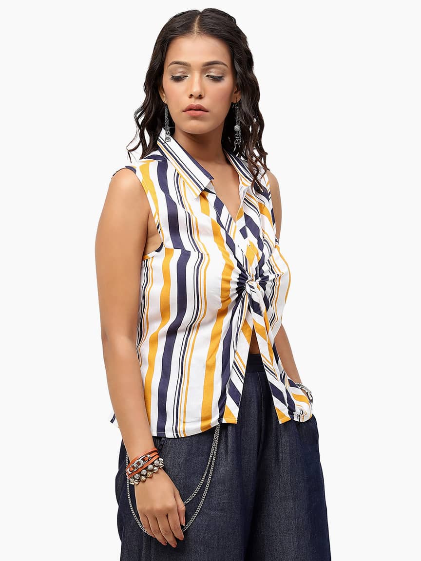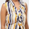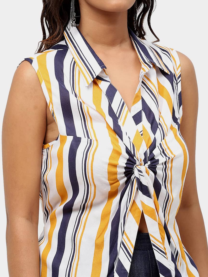 BaawRi Women’s White Stripe Rayon Top, has a Shirt Collar, sleeveless, front knot and curved hem.