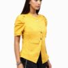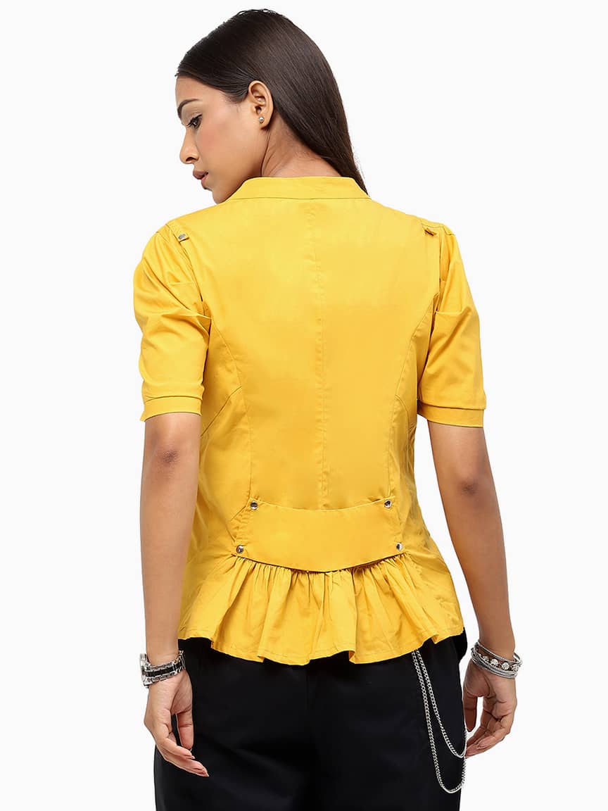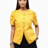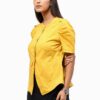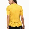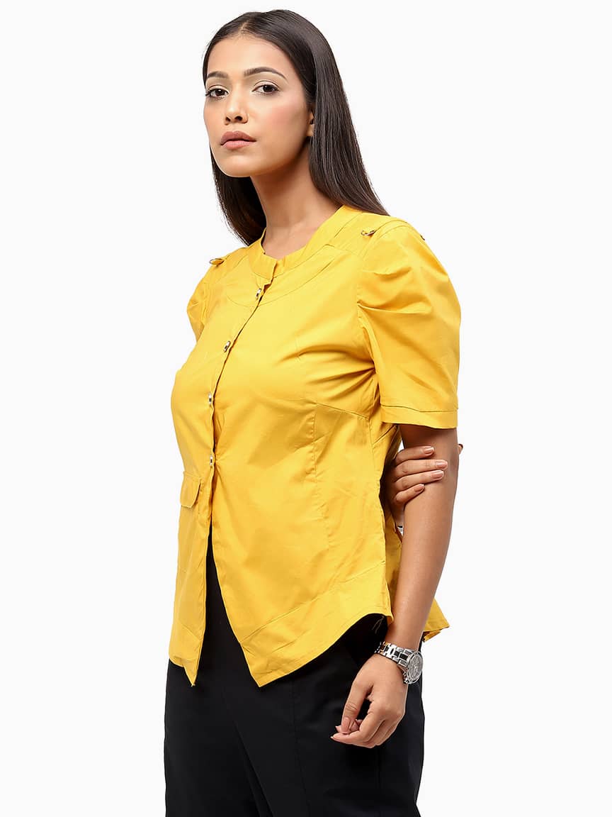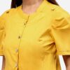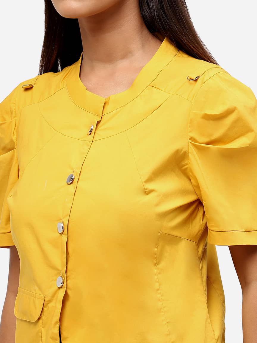 BaawRi Women’s Yellow Solid Color Cotton Jacket, has a round neck, half sleeves, front button closure and curved hem.