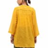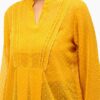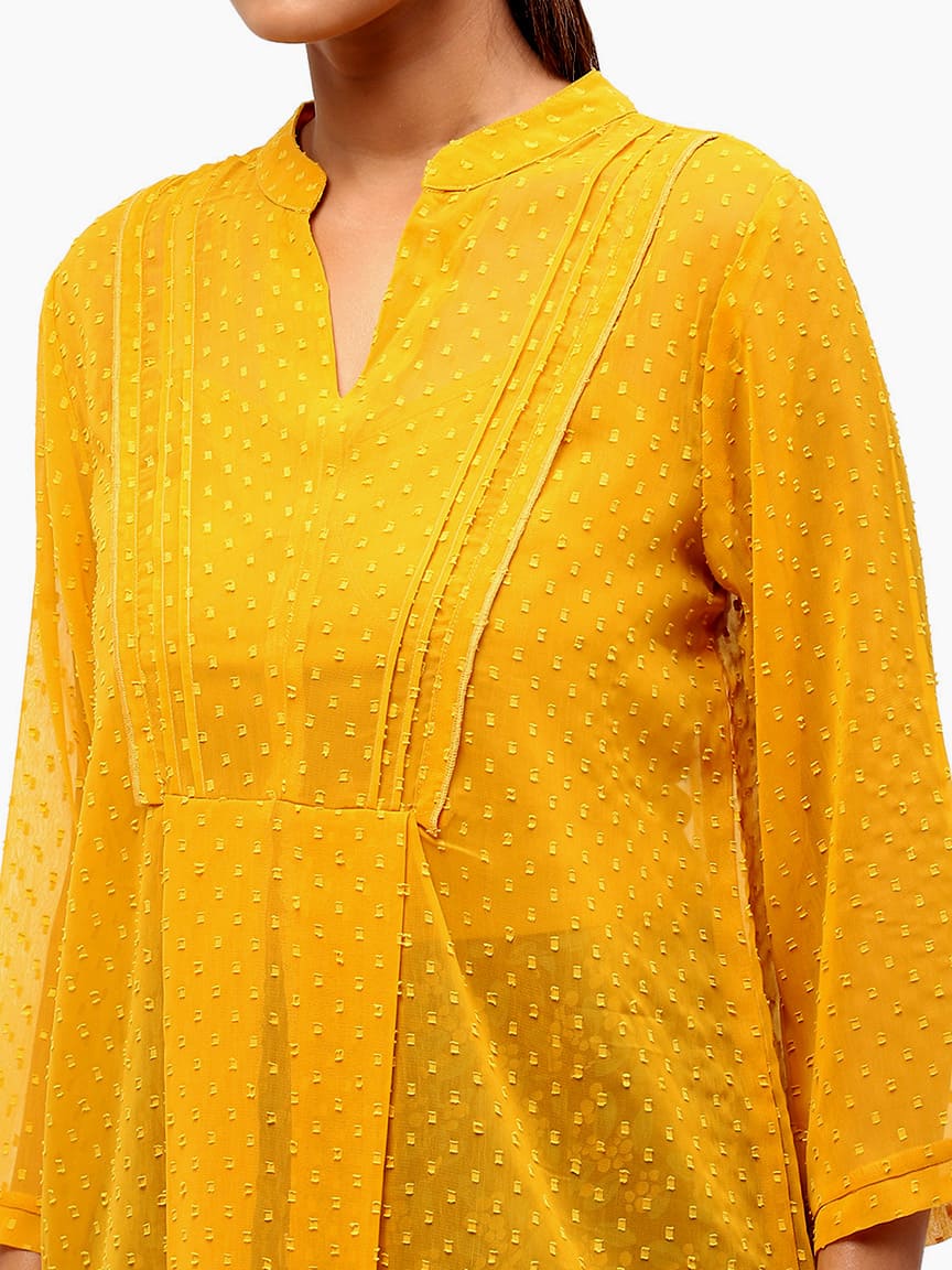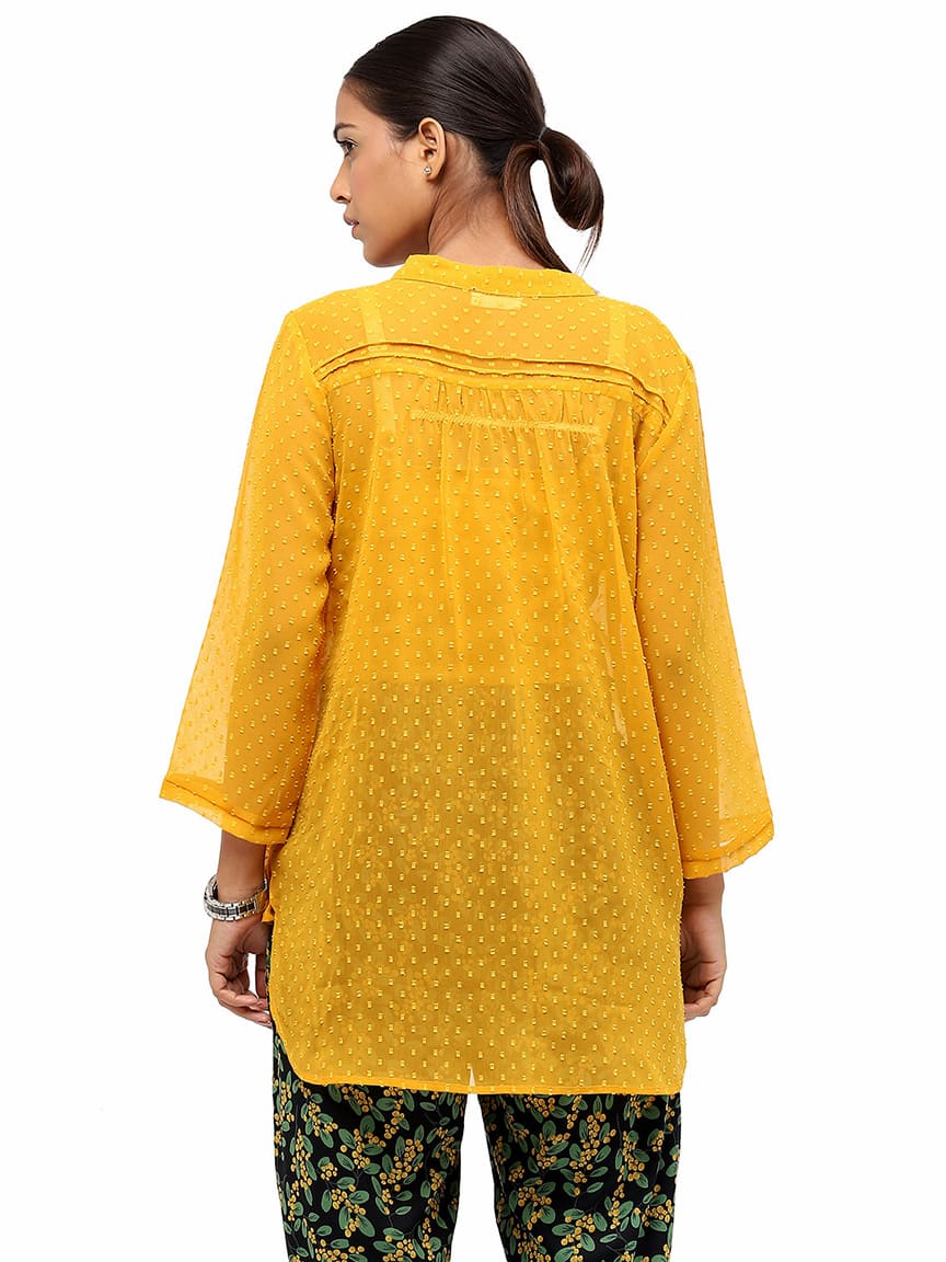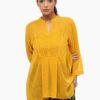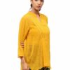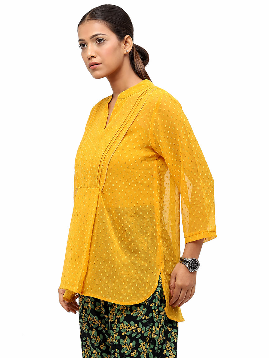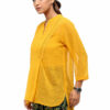 BaawRi Women’s Yellow Solid Color Top, has a mandarin collar, 3/4th sleeve, pleated and curved hem.