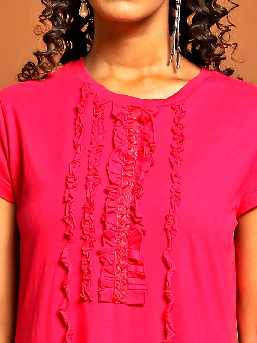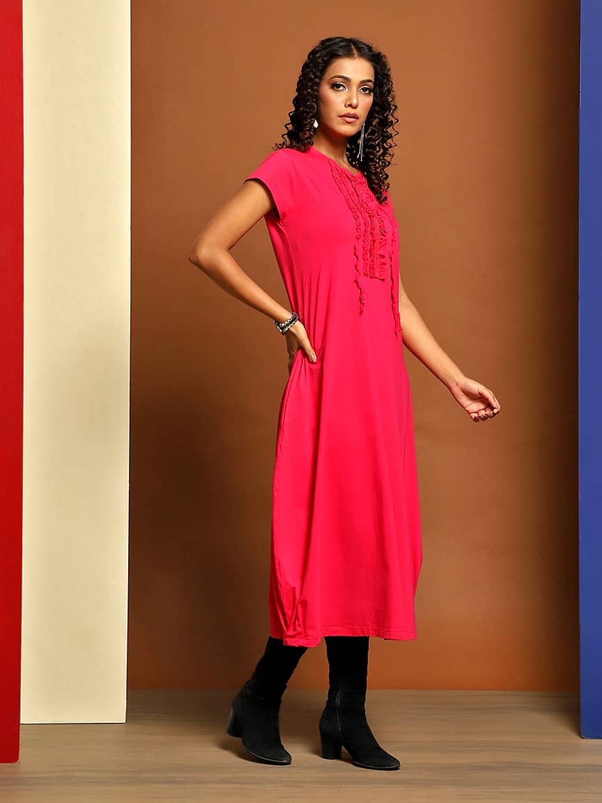 • Raw Cut Ruffles: Frontal raw cut gathered-on vertical ruffles add a touch of whimsy and texture, creating a unique visual appeal.