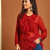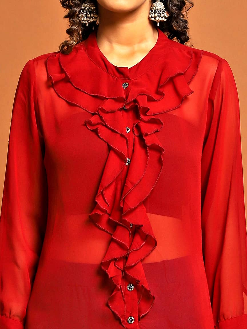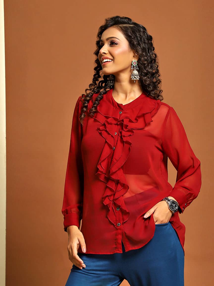 • Perfect for both casual and dressy occasions, our Translucent Georgette Button-Through Ruffle Top seamlessly combines grace with a contemporary edge. Embrace the beauty of contrasts and make a statement with every wear.”