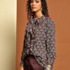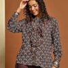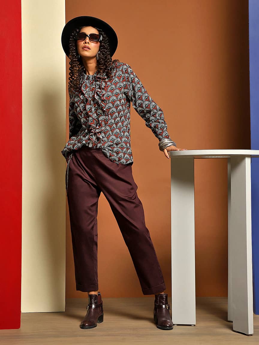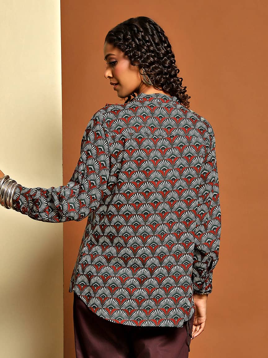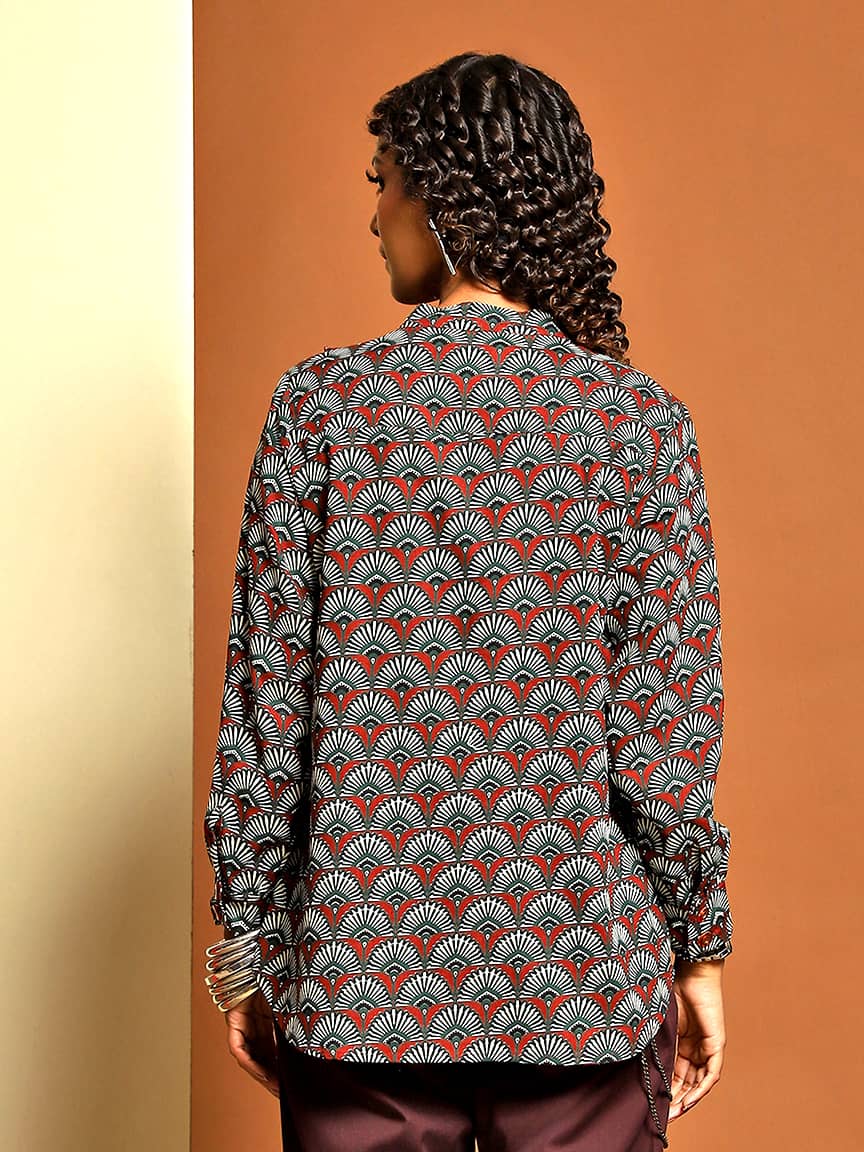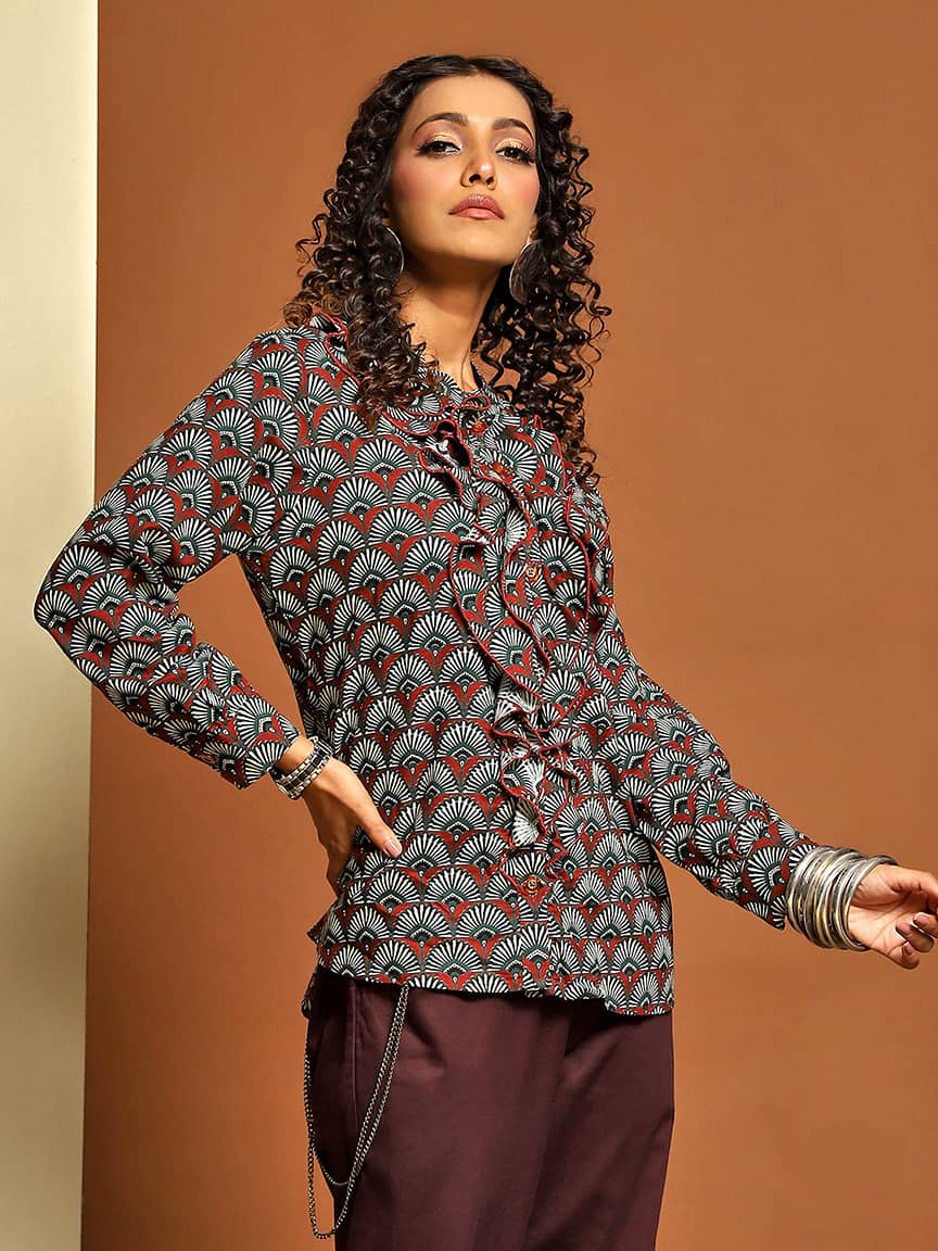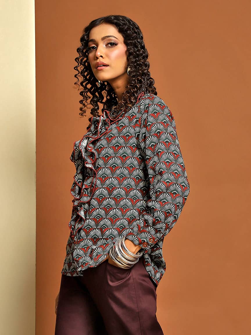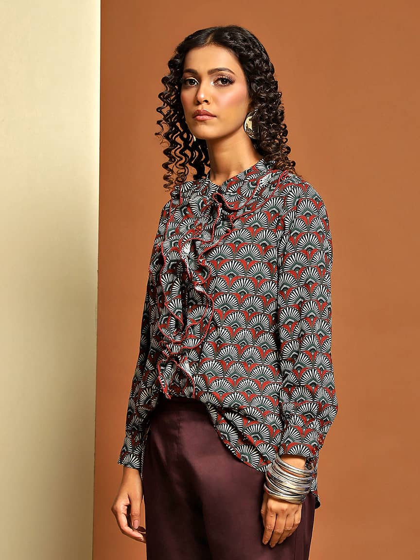 Curated Pattern Green Printed Button-Through Ruffle Top