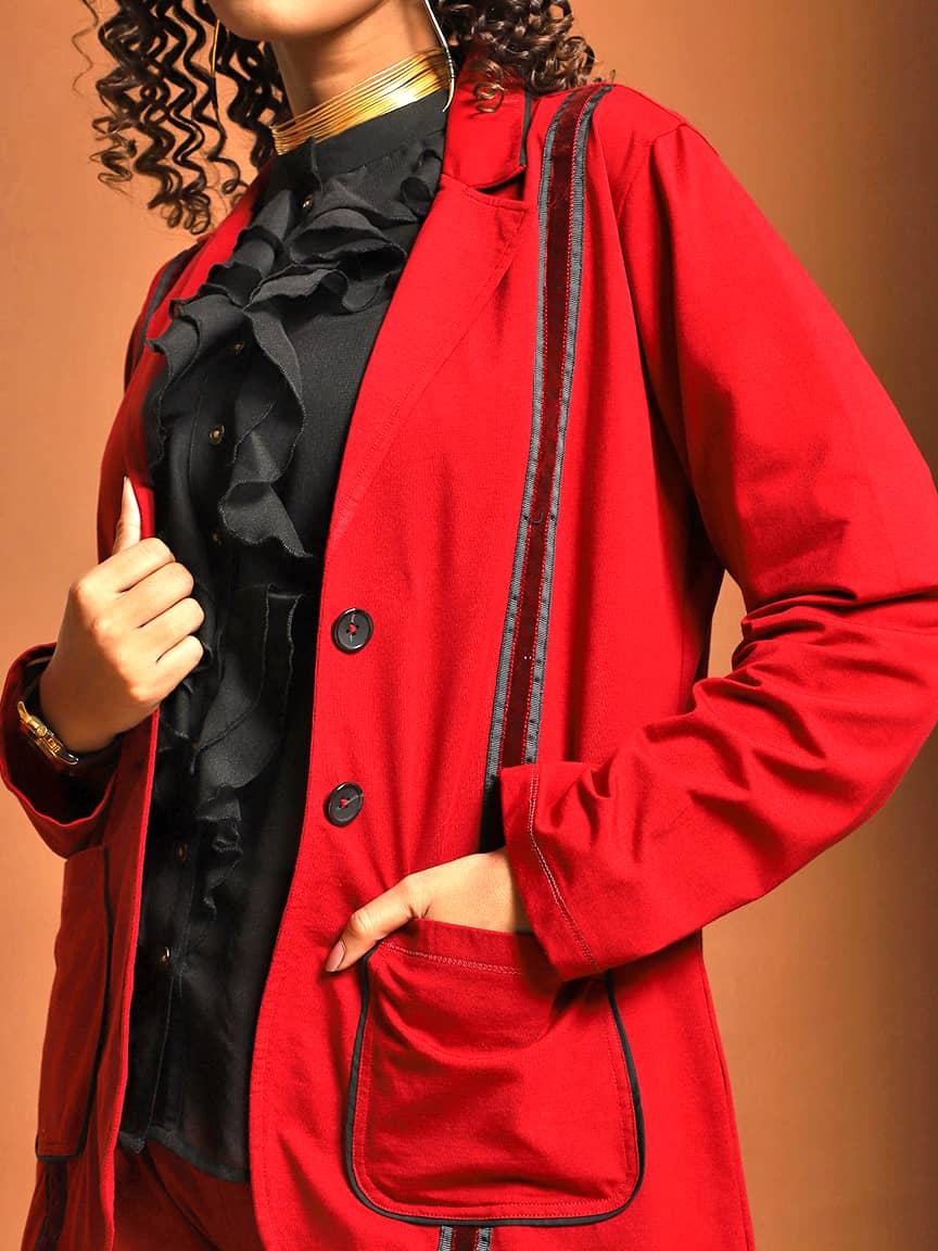 • Oversized Patch Pockets: Functionality meets fashion with oversized patch pockets adorned with black decorative piping, offering a striking visual appeal.