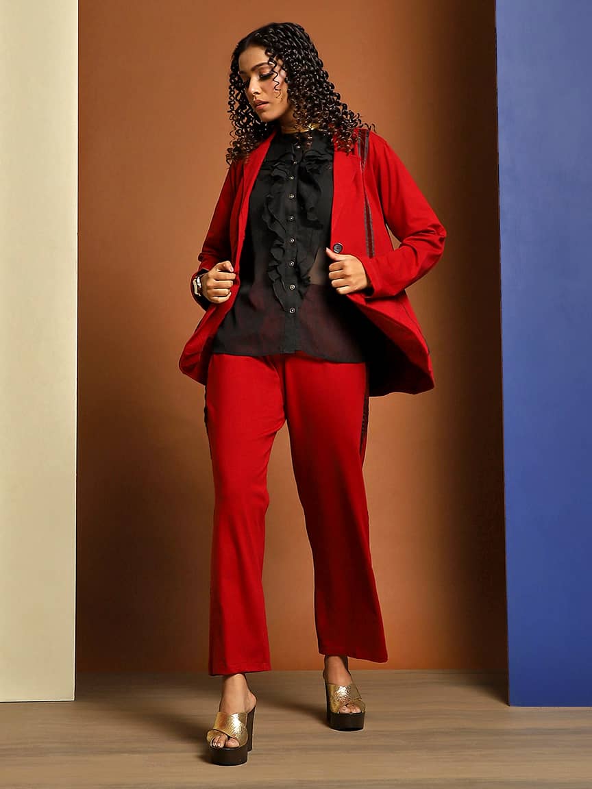 • Velvet Tape Detailing: Luxurious velvet tape detailing enhances the overall richness of the ensemble, exuding opulence.