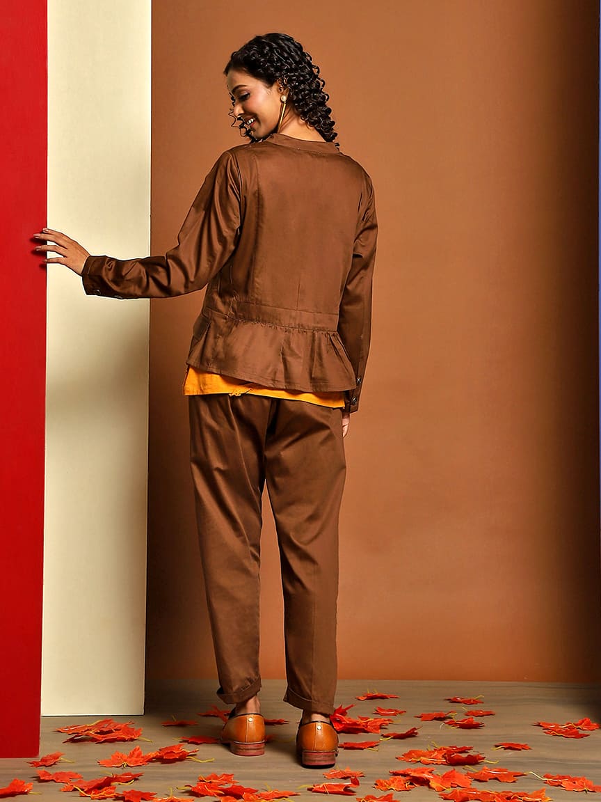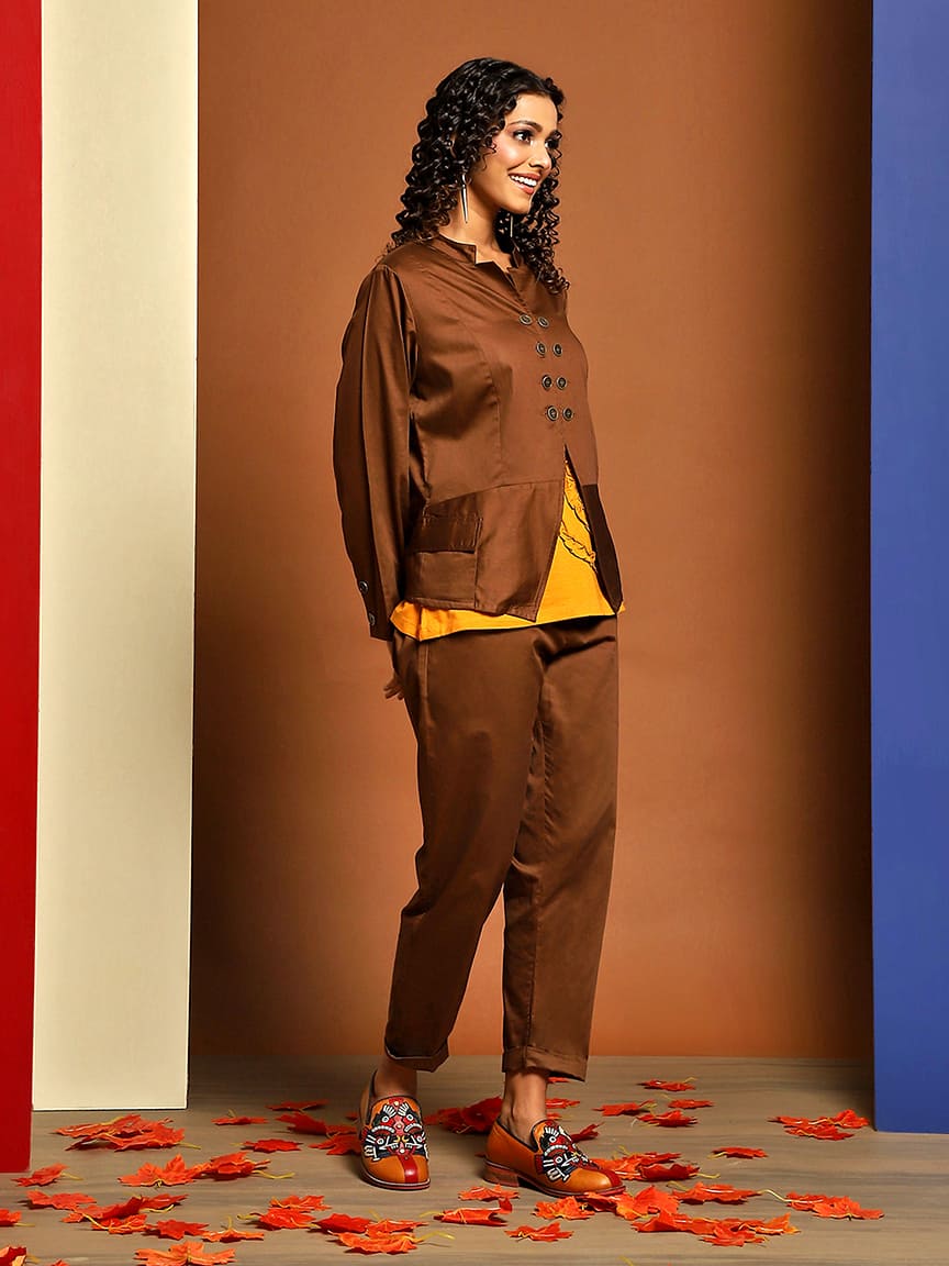 • Perfect for both casual and formal occasions, our Stand Collar Jacket Set is designed to make a lasting impression.”