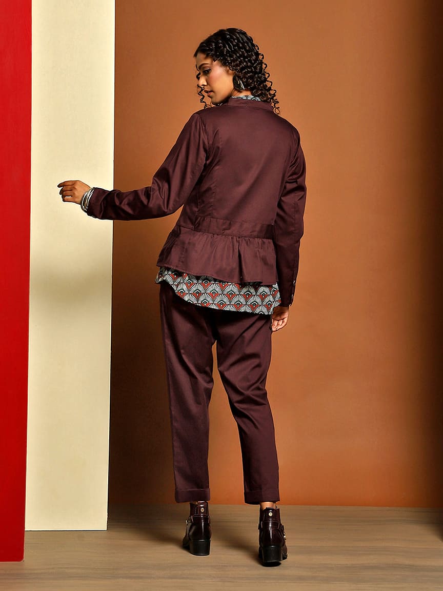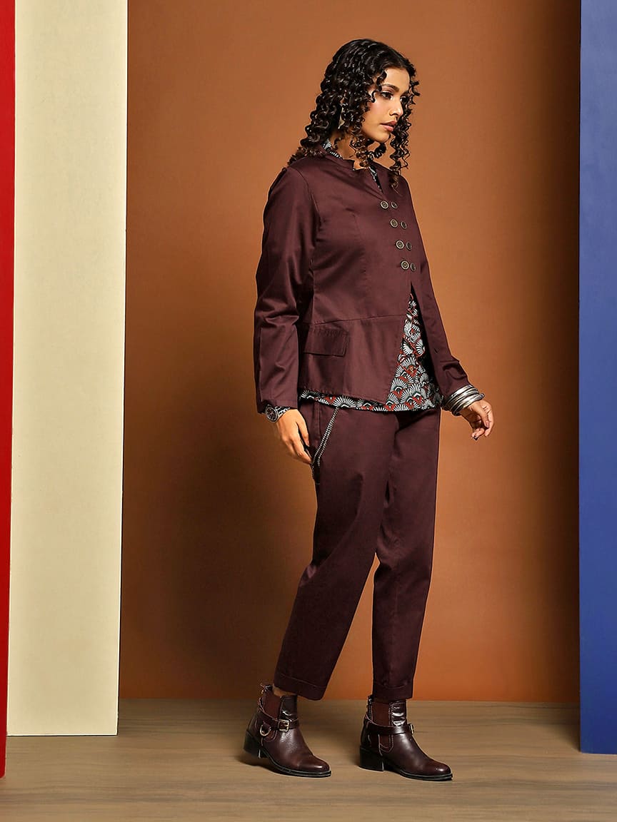 • Perfect for both casual and formal occasions, our Stand Collar Jacket Set is designed to make a lasting impression.”