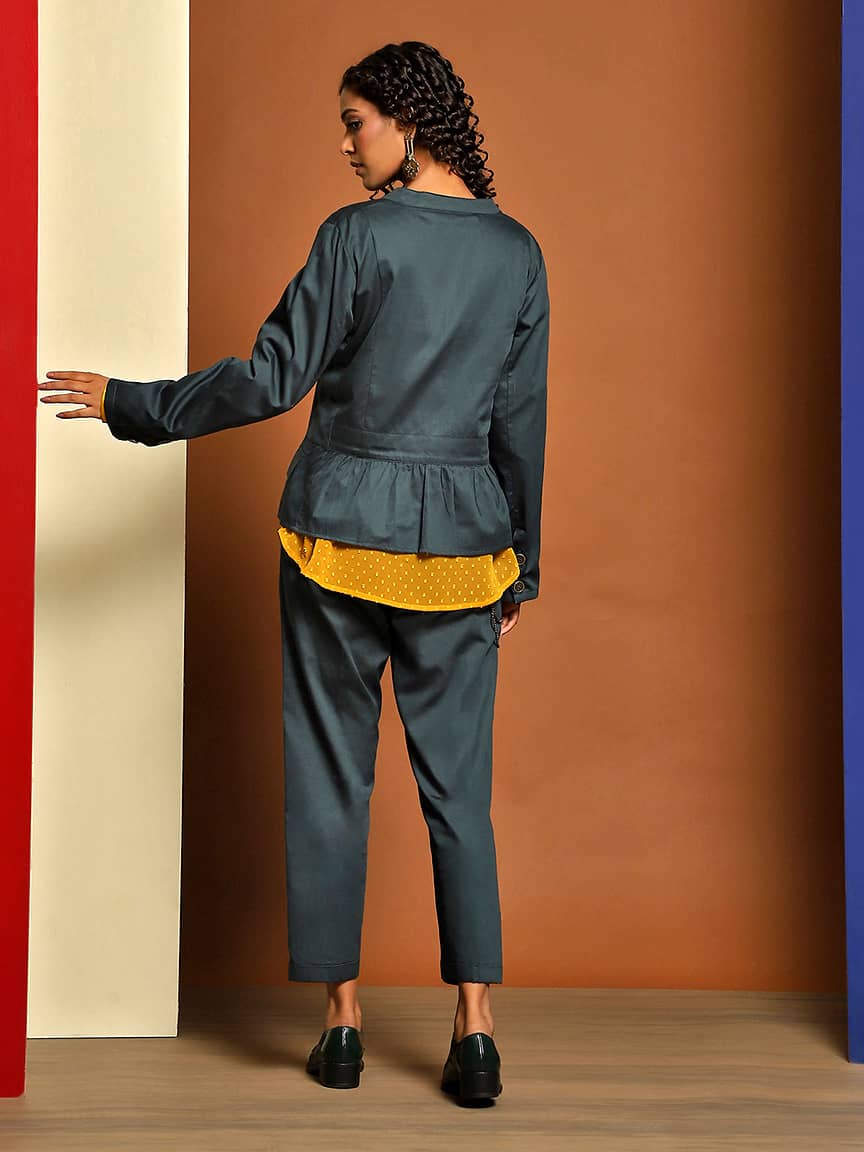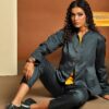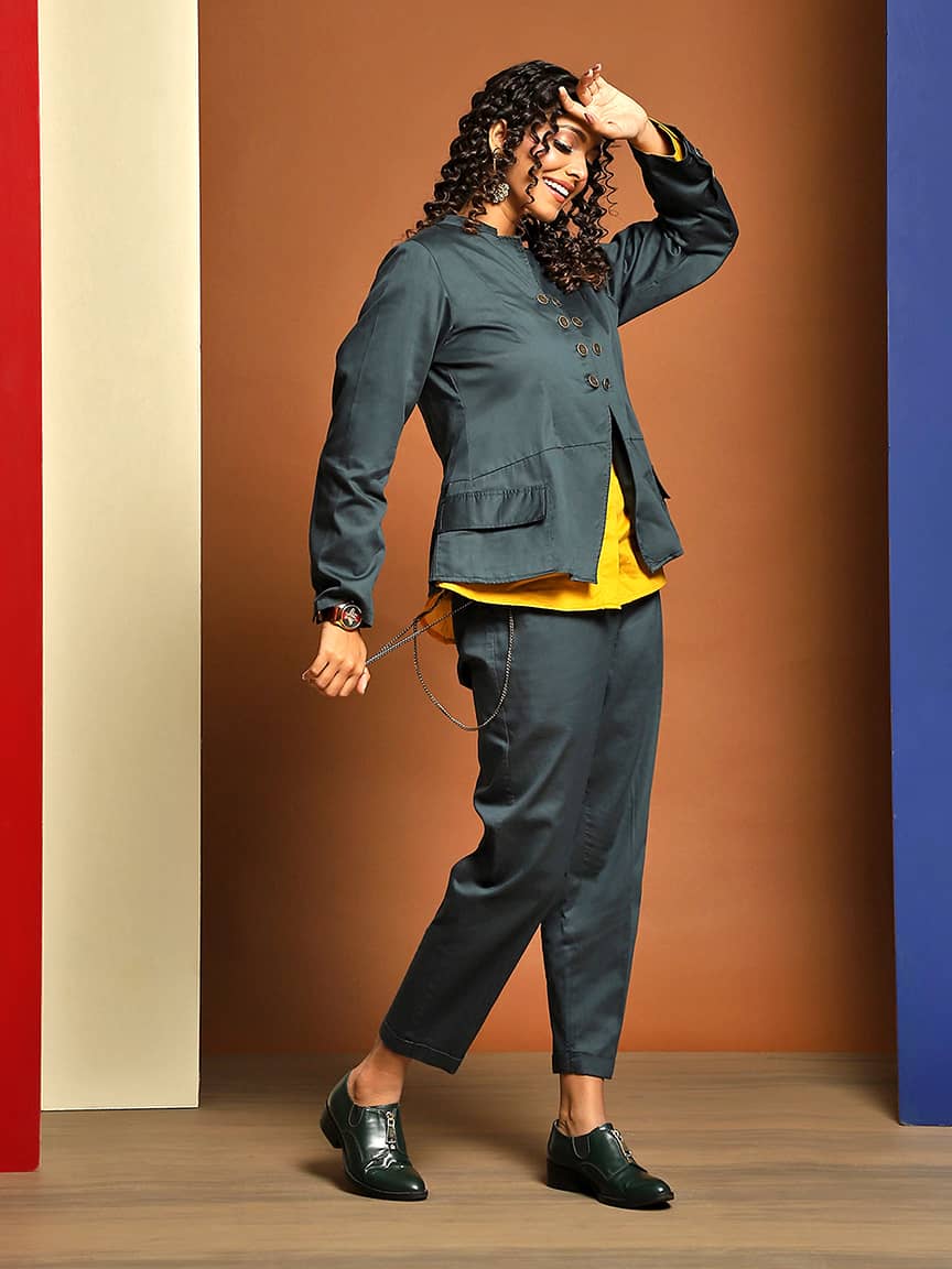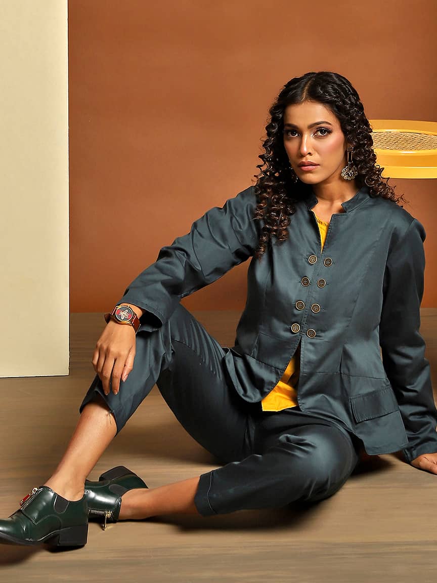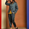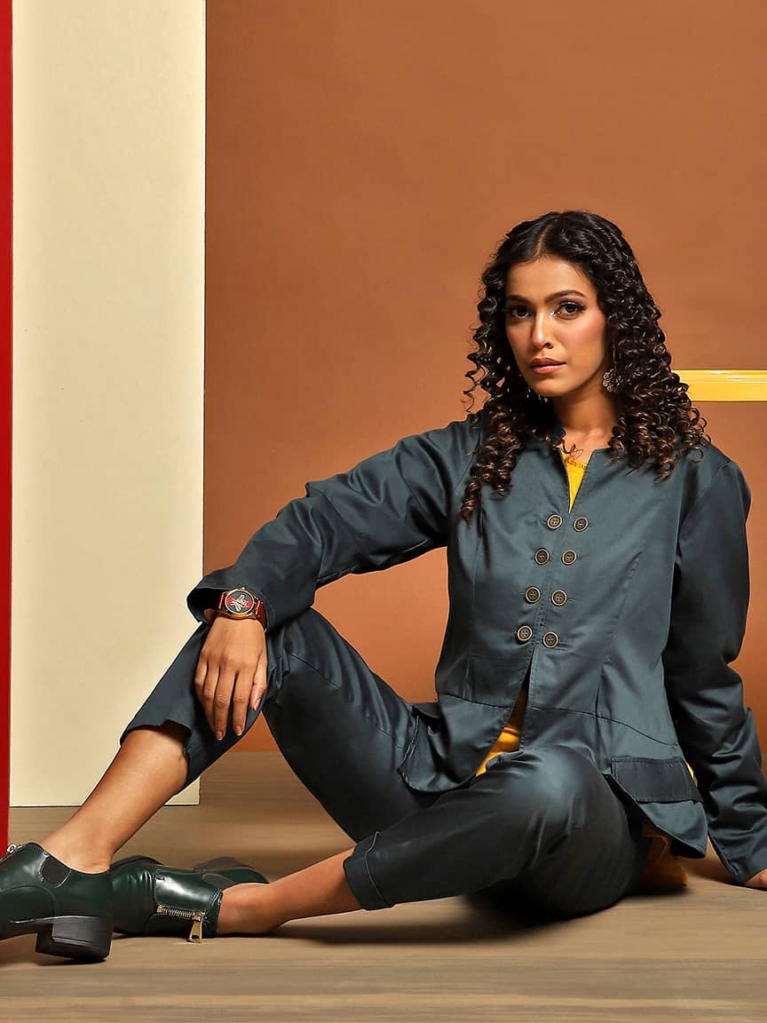 • Perfect for both casual and formal occasions, our Stand Collar Jacket Set is designed to make a lasting impression.”