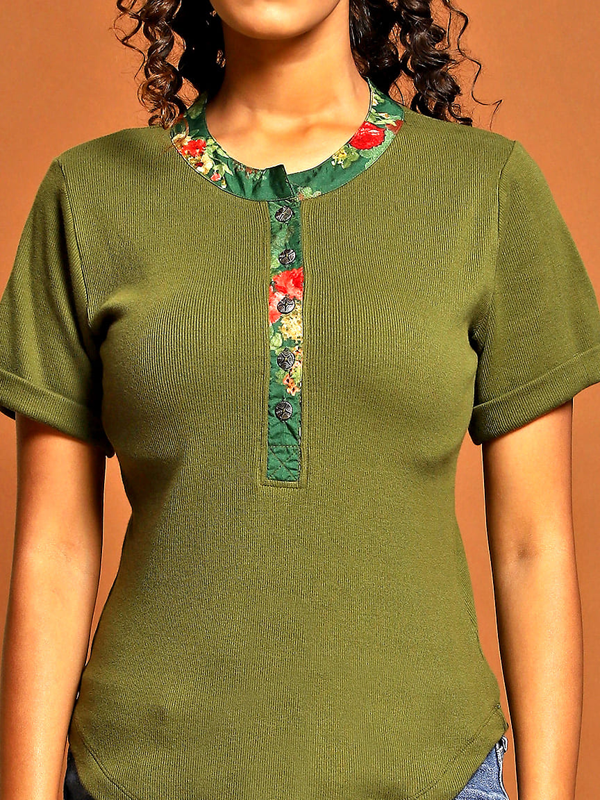 Ribbed Top with Print Detailing on the Neck & Button Placket